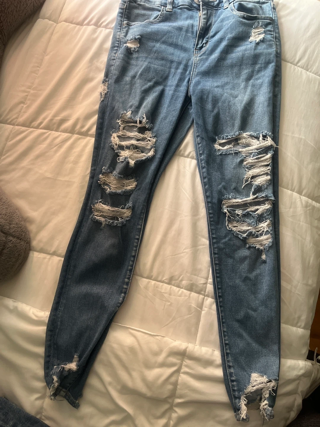 Selling a pair of well-loved, distressed skinny jeans. They have a light wash and lots of rips for a stylish, edgy look! They are in good condition.