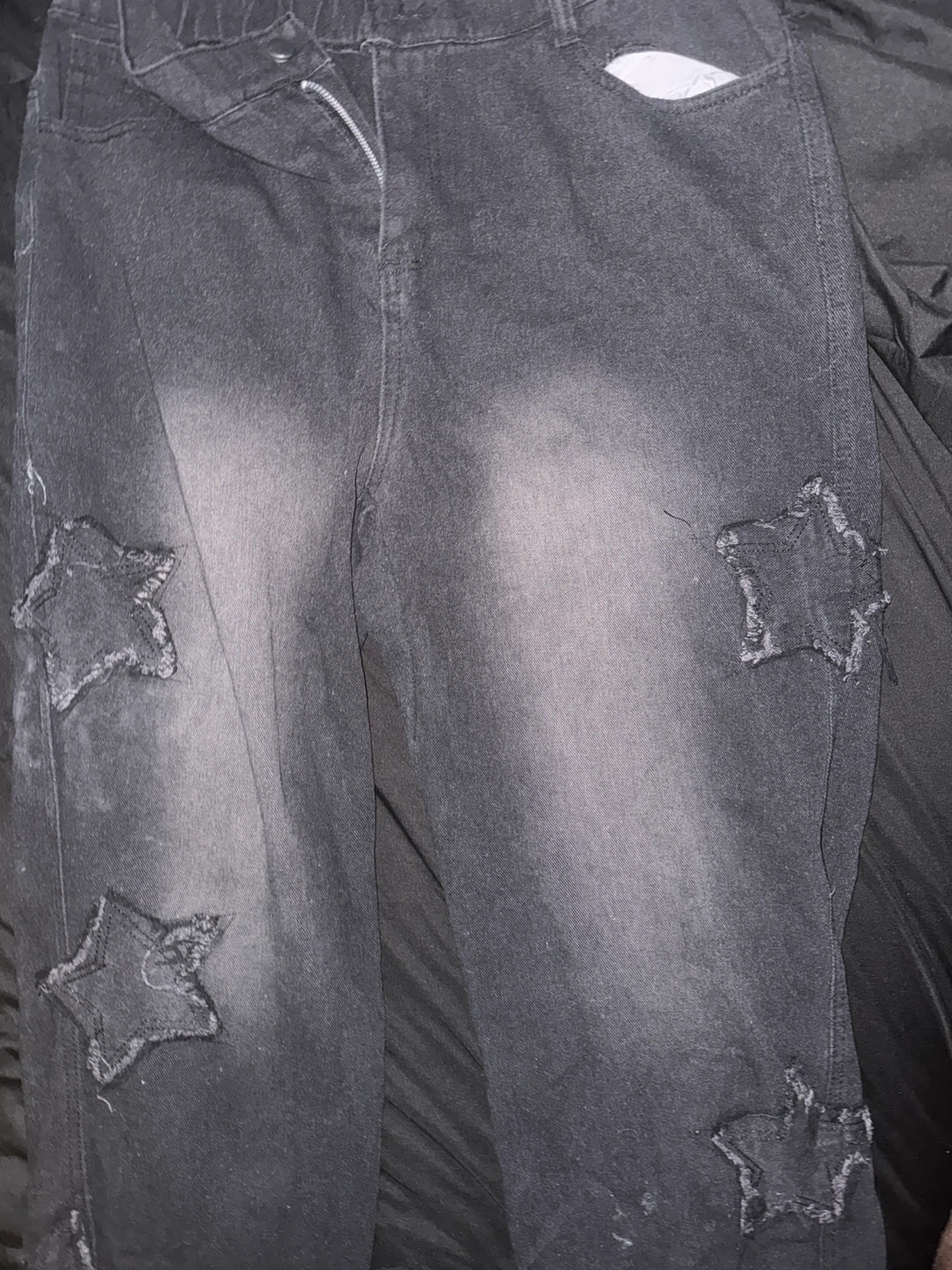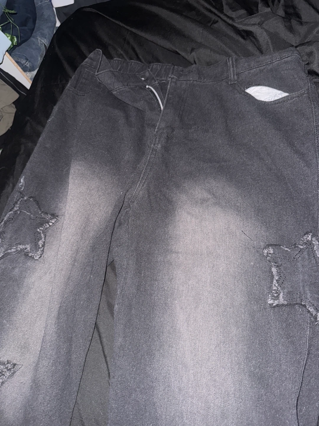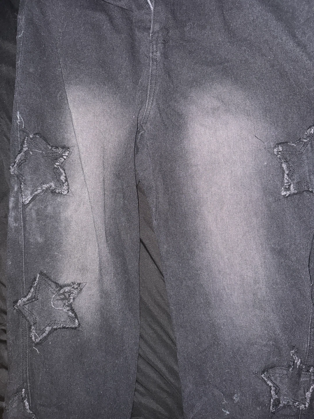 15Selling a pair of black jeans with a cool distressed star design! They're in great condition and ready for a new home