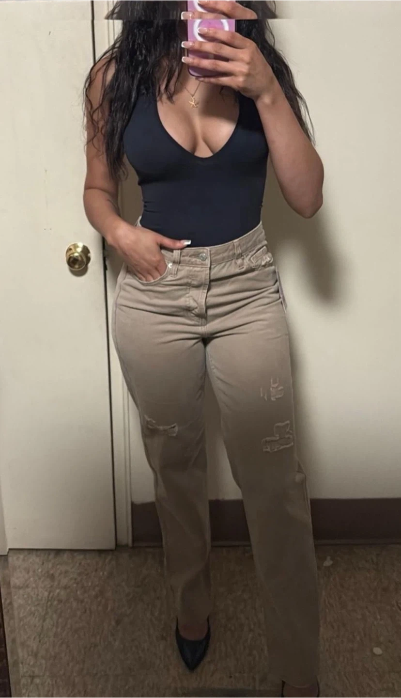 Selling a pair of tan jeans with a distressed look. They're in good condition and ready for a new home!