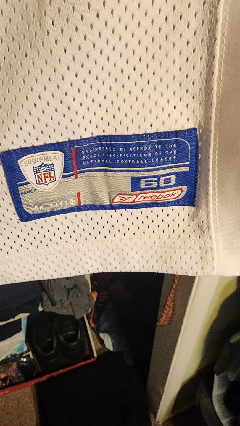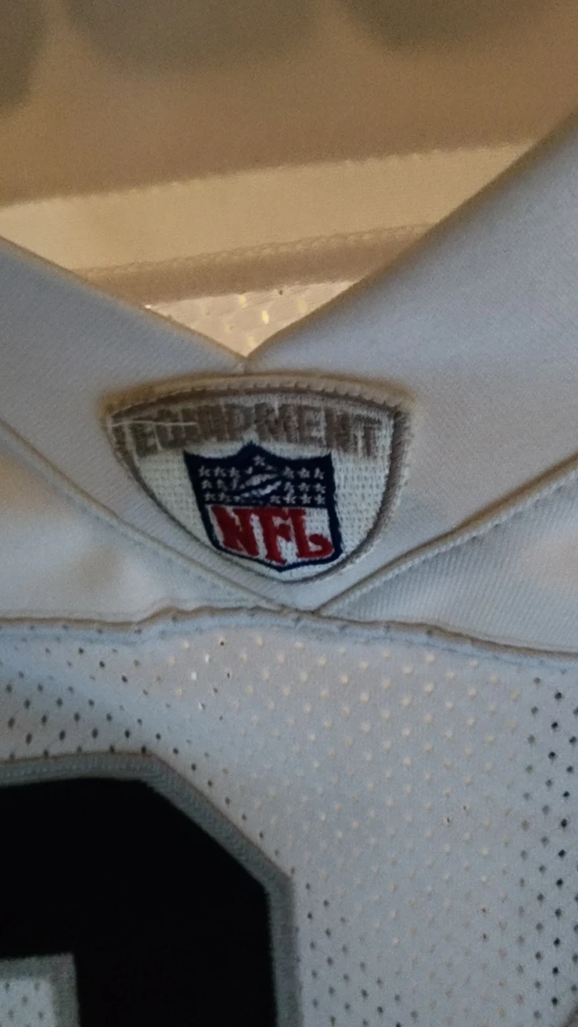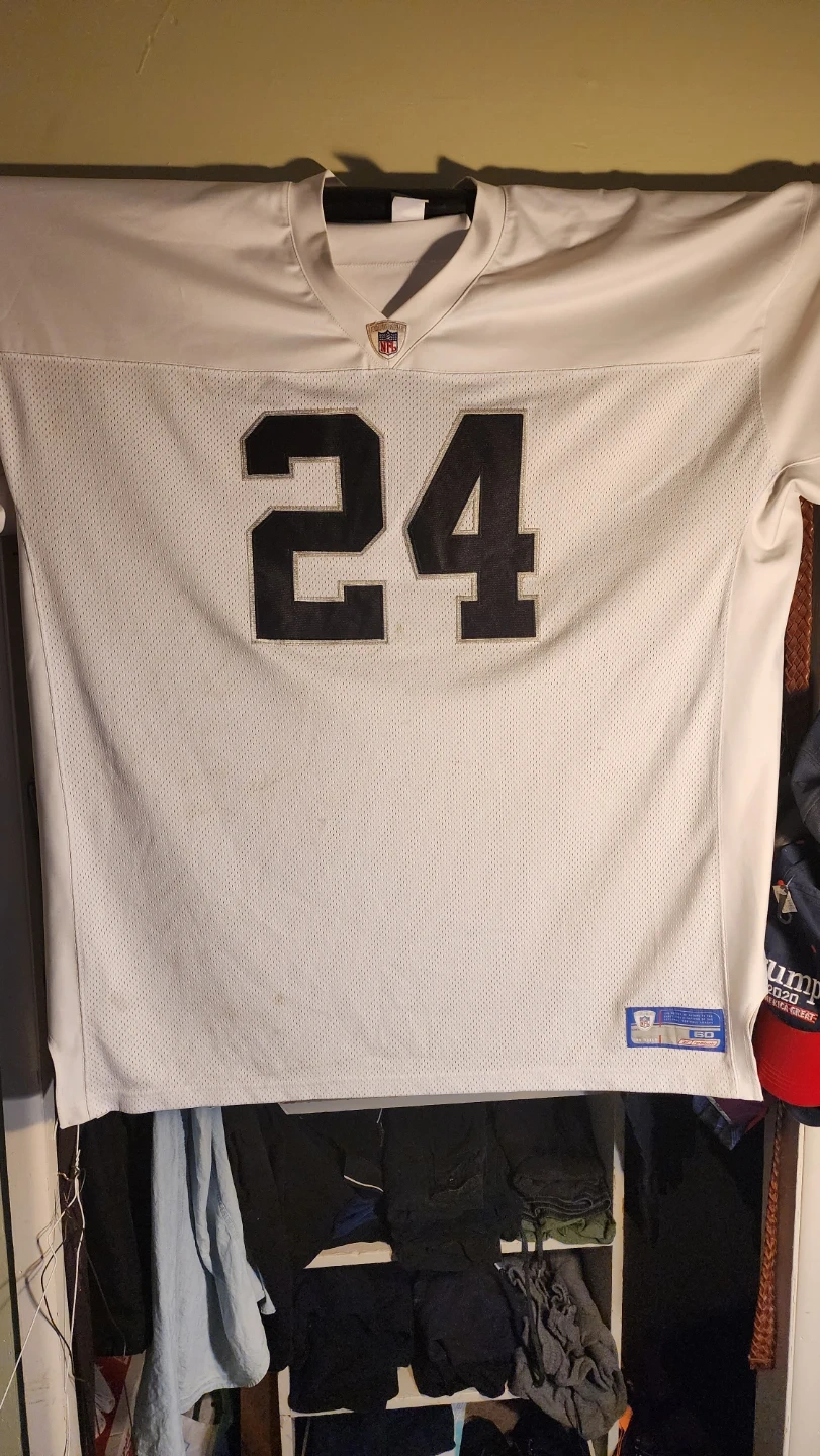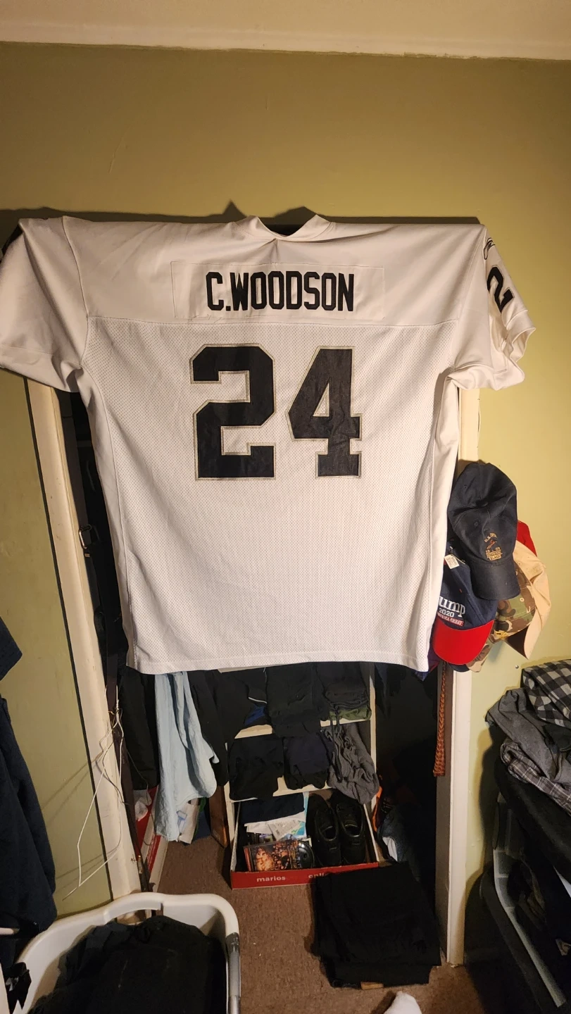 This is a white Oakland Raiders jersey with the number 24 and 'C. Woodson' on the back. It's made by Reebok and features NFL Equipment branding. Size is 60.