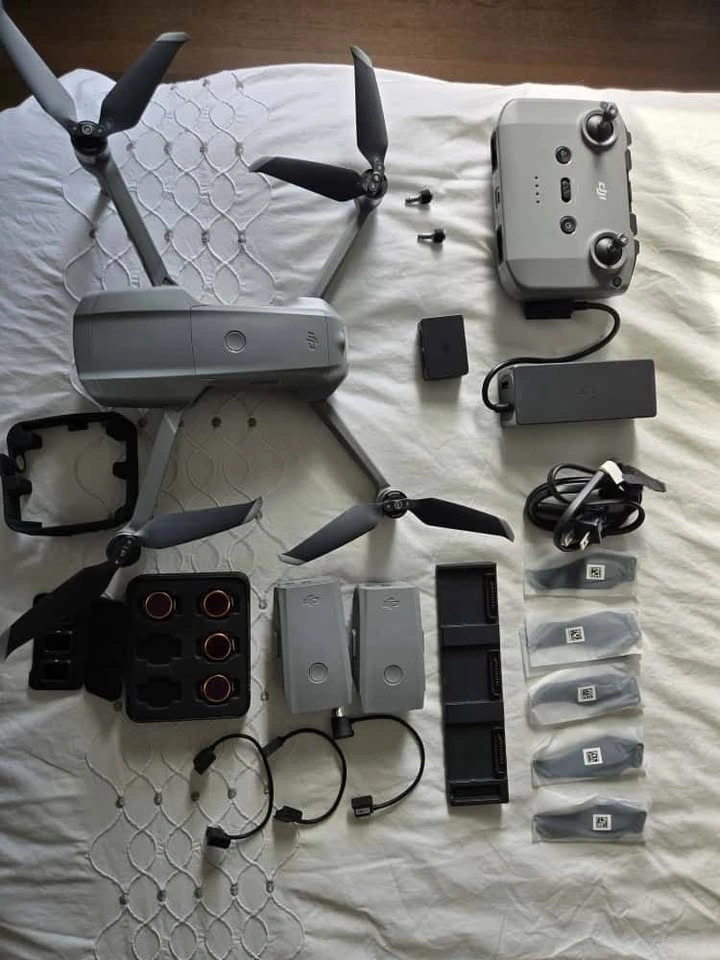 DJI Mavic Air 2 with Fly More Kit. Extra props, 3 batteries, camera filters, battery charger, two remotes, and the molded storage case are included. It has been lightly used.