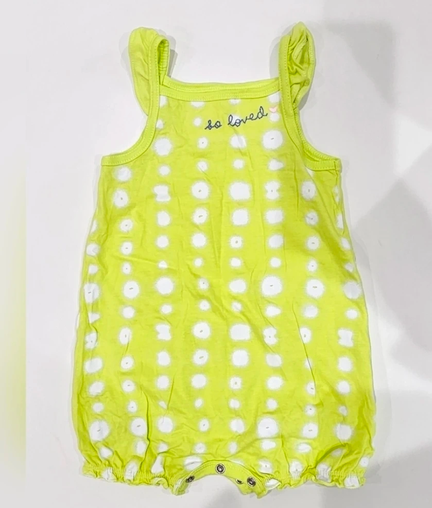 Brand new. This adorable Carter's romper is in great condition and ready for a new home! It's a cute green with white polka dots and has the words 'so loved' embroidered on the back. Made of 100% cotton, exclusive of decoration, it's soft and comfy for your little one. Size is 18 months.