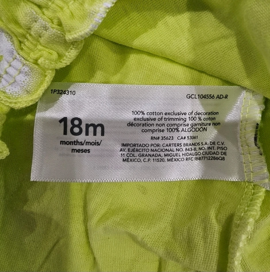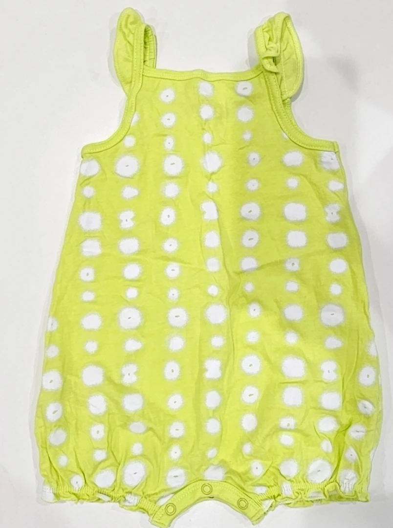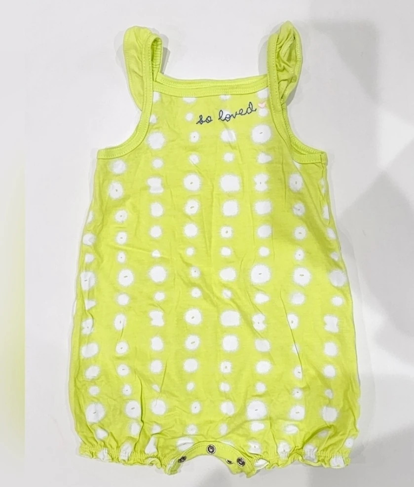 Brand new. This adorable Carter's romper is in great condition and ready for a new home! It's a cute green with white polka dots and has the words 'so loved' embroidered on the back. Made of 100% cotton, exclusive of decoration, it's soft and comfy for your little one. Size is 18 months.