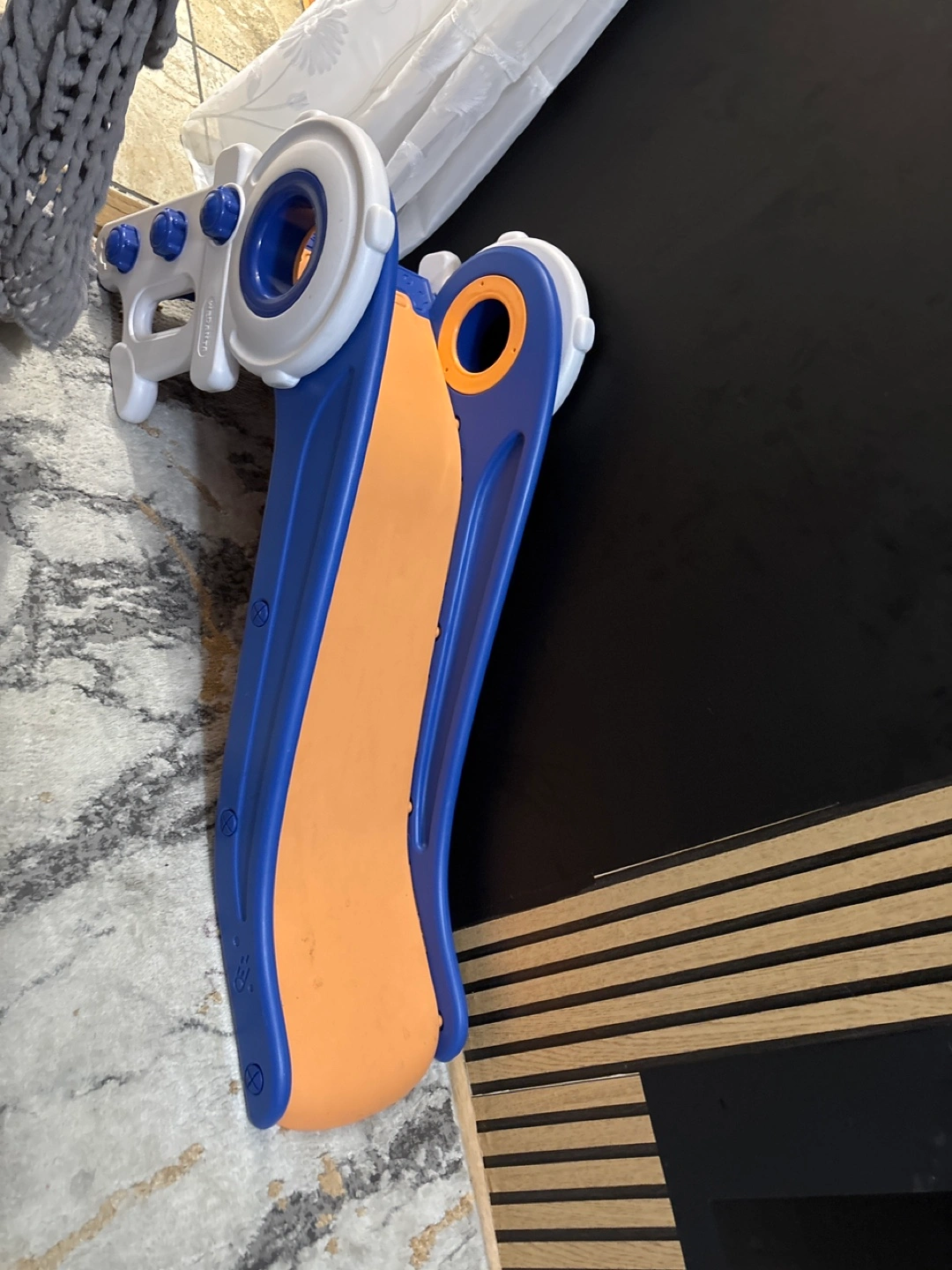 Indoor/outdoor toddler slide. Compact size, easy storage. Blue, orange, and white plastic. Good used condition.