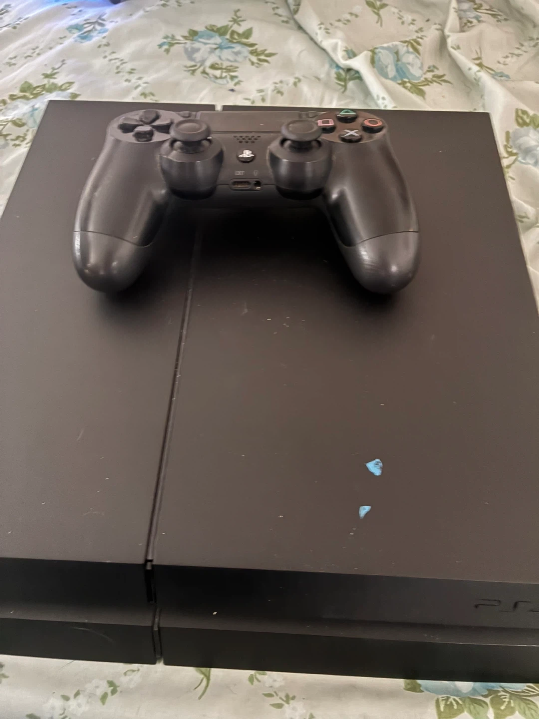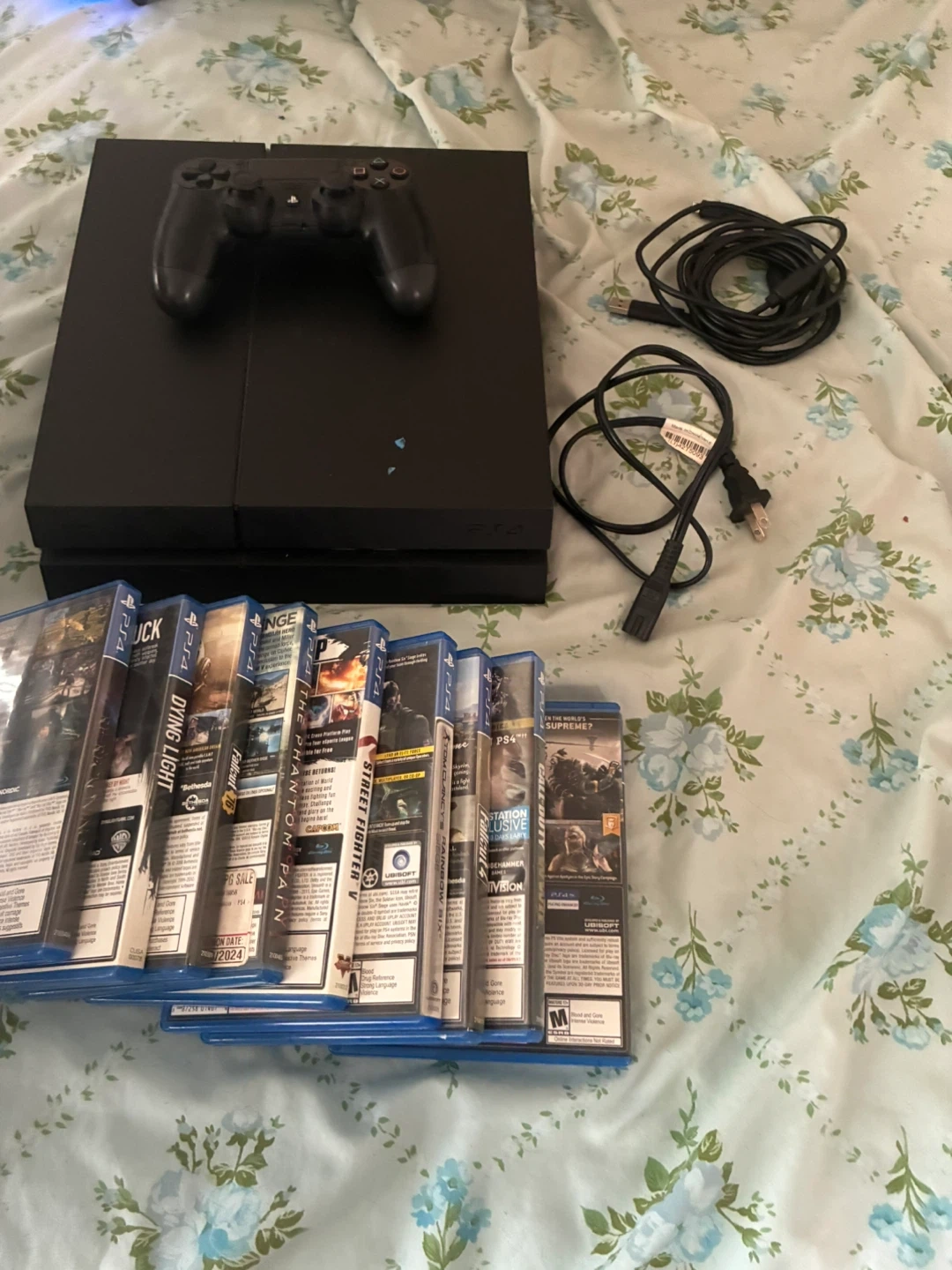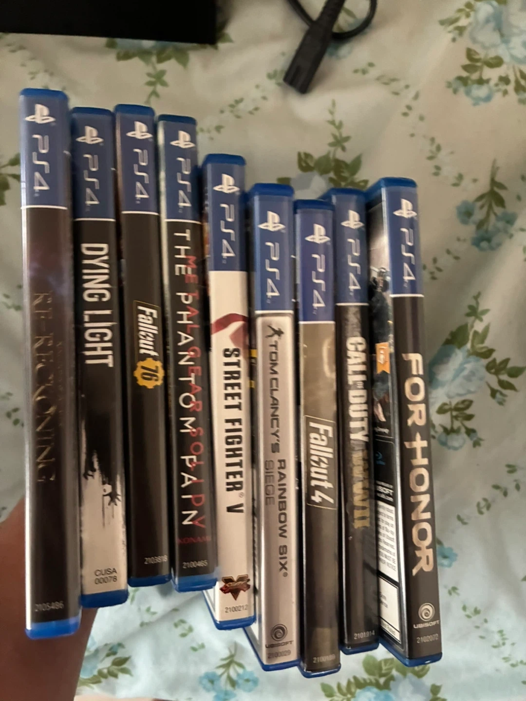 Selling a Sony PlayStation 4 console with one controller and nine games. Includes all necessary cables. Games included are Dying Light, Fallout 76, The Phantom Pain, Street Fighter V, Rainbow Six Siege, Fallout 4, Call of Duty, and For Honor