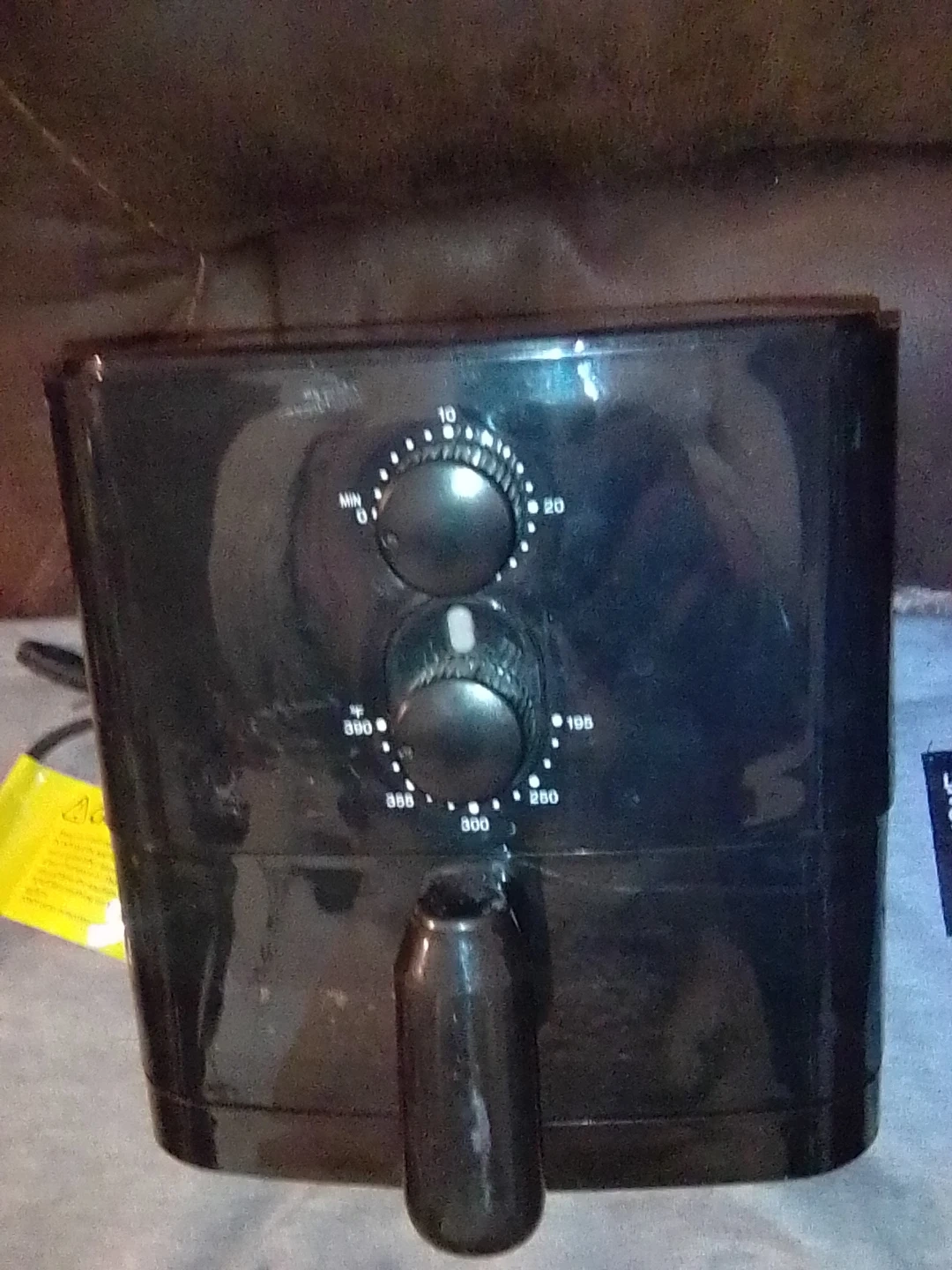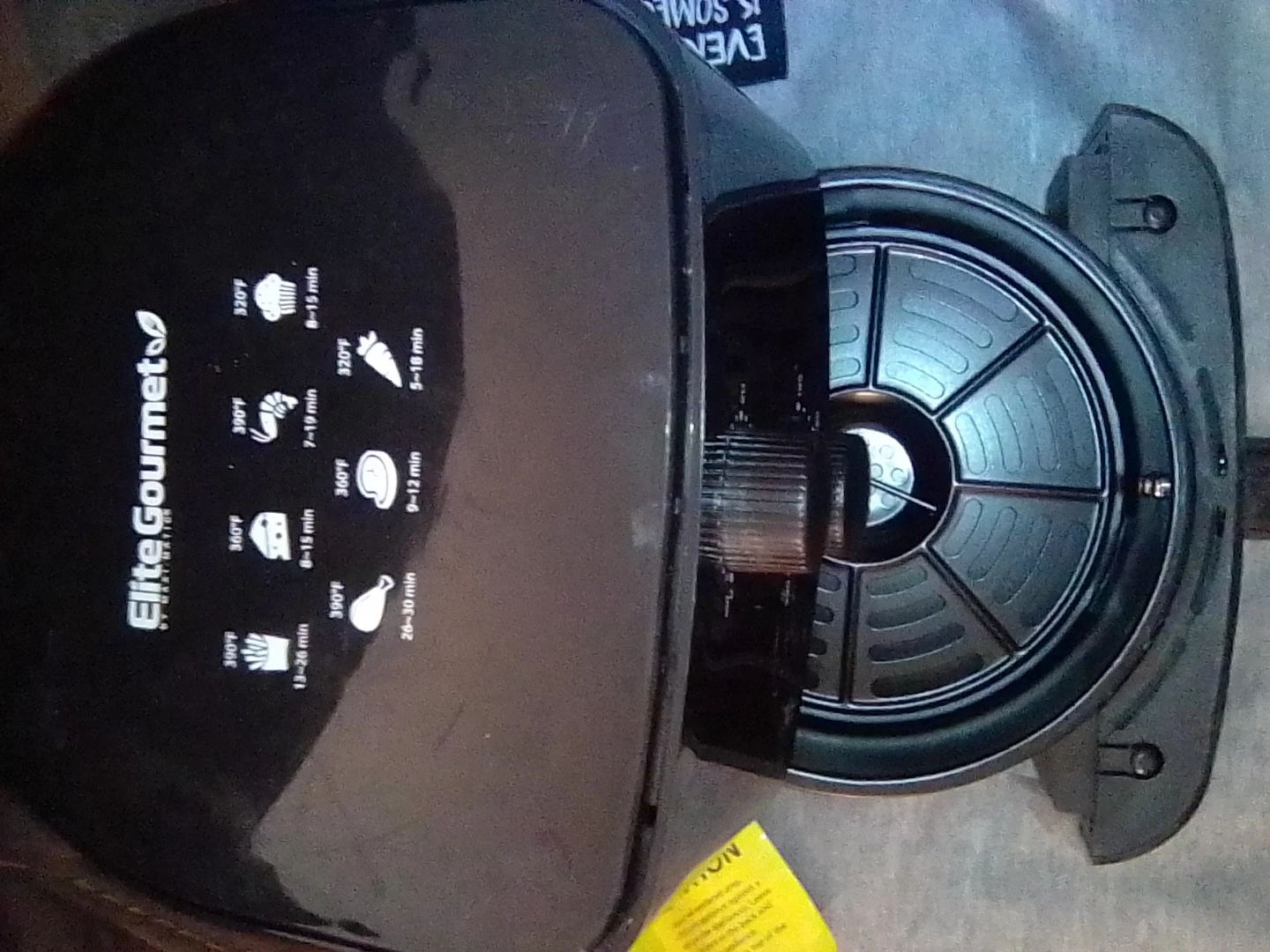 This Elite Gourmet air fryer is black. It has two control knobs for temperature and time. The lid displays cooking suggestions for common foods.