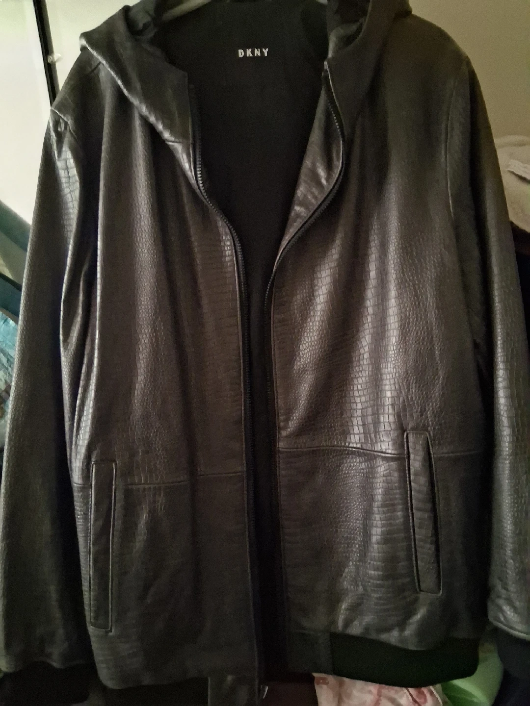 15Selling a DKNY black leather jacket with a hood! The jacket has a unique textured pattern. It's in great condition and ready for a new home