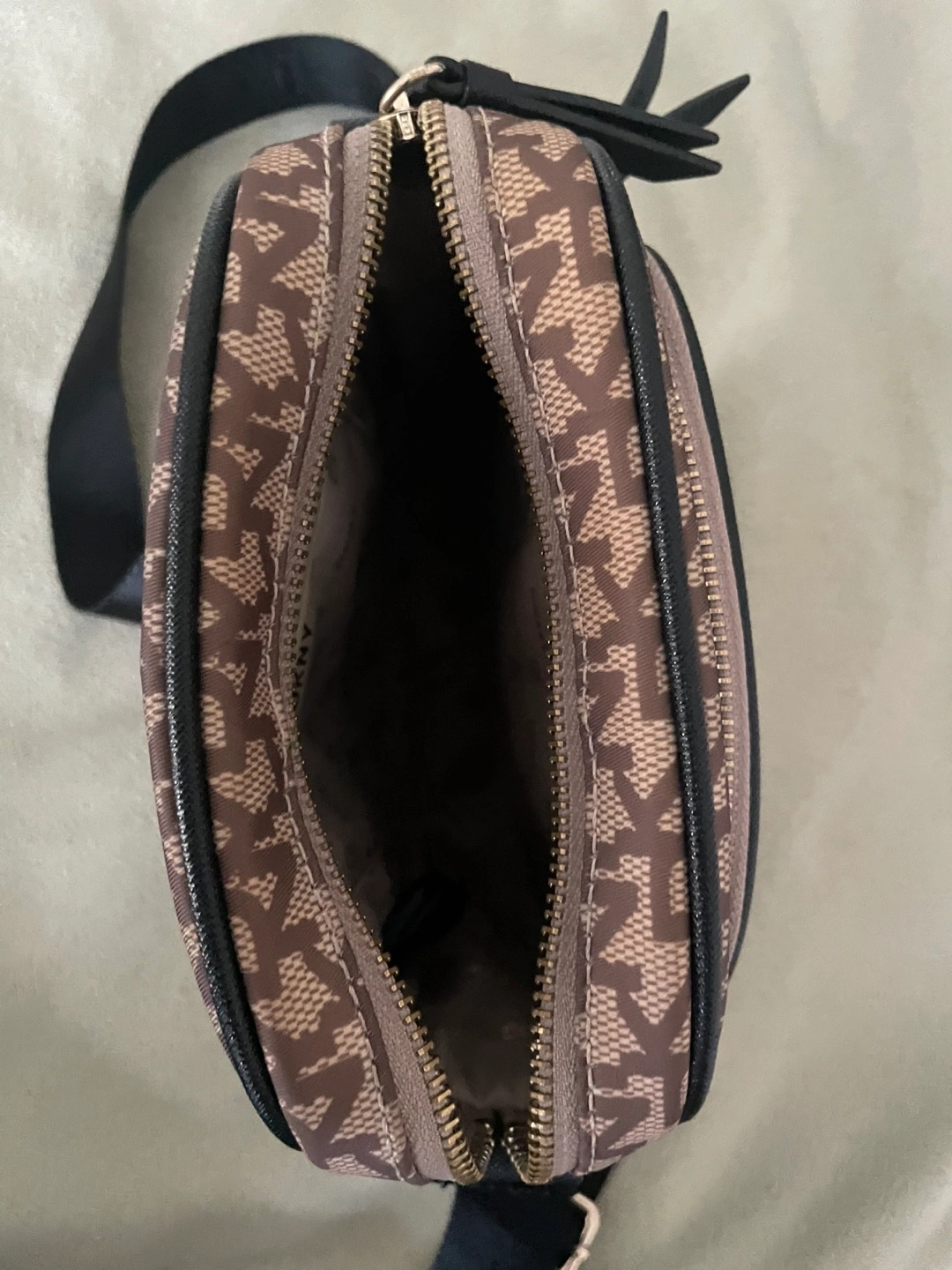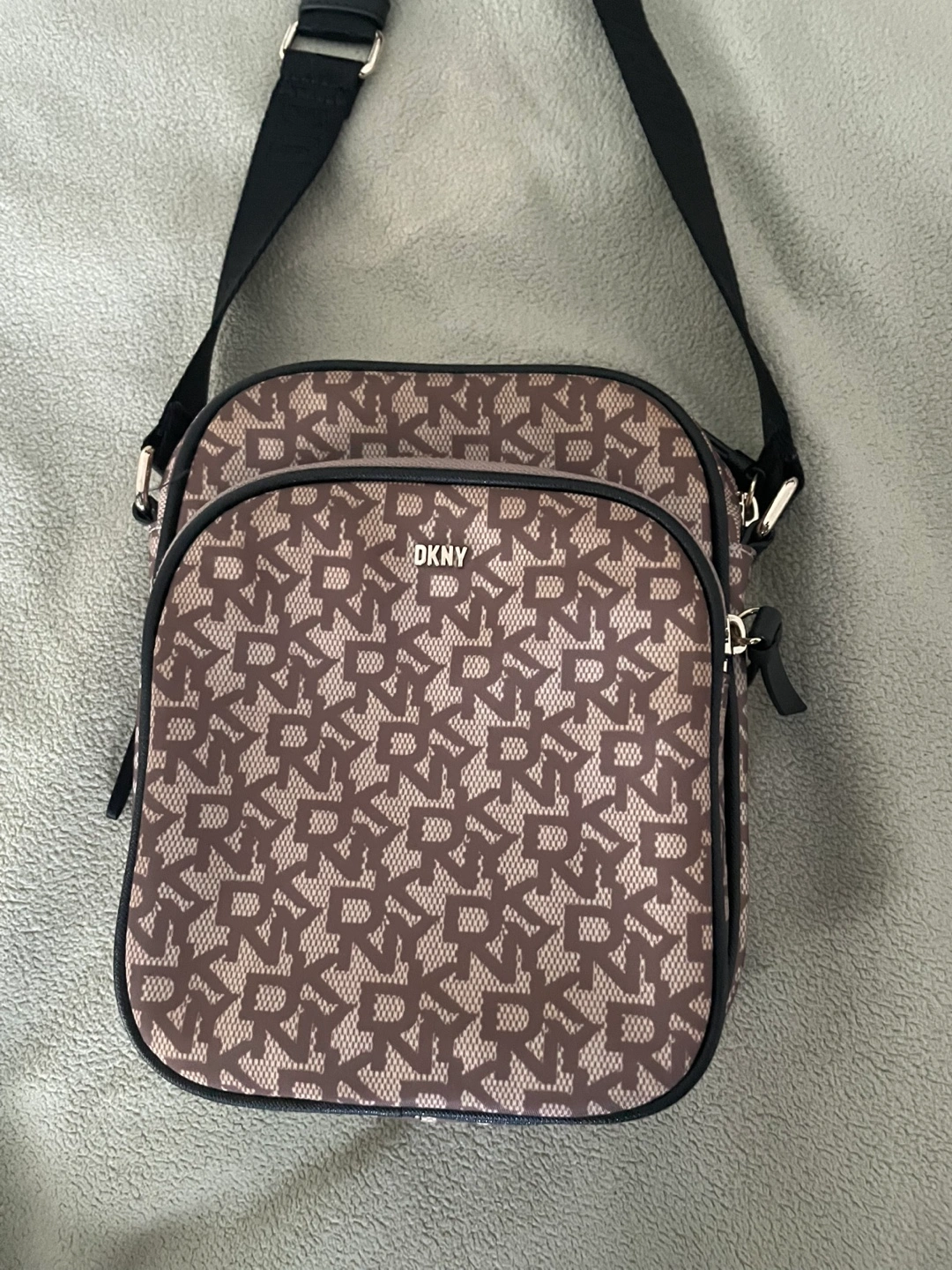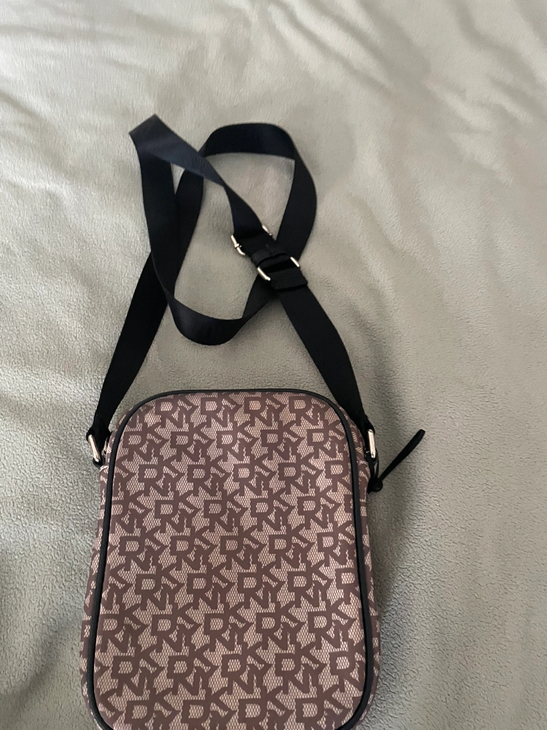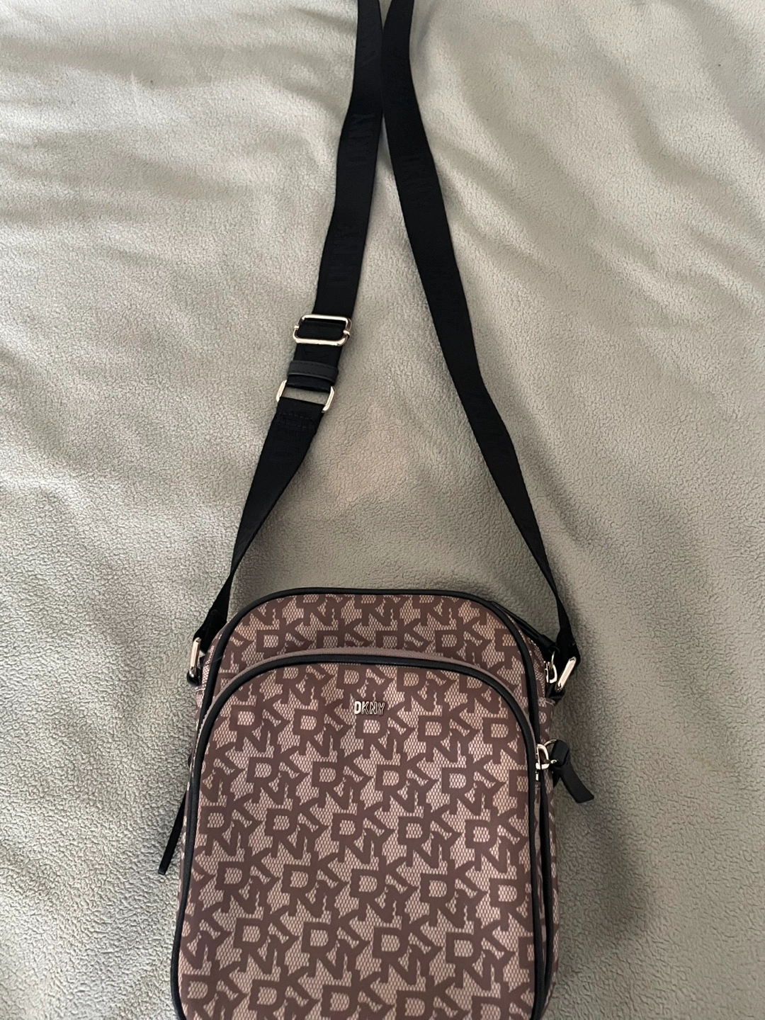 Selling a DKNY crossbody bag. It features a brown and beige monogram pattern with a black strap. The bag has a zip closure and is in great condition
