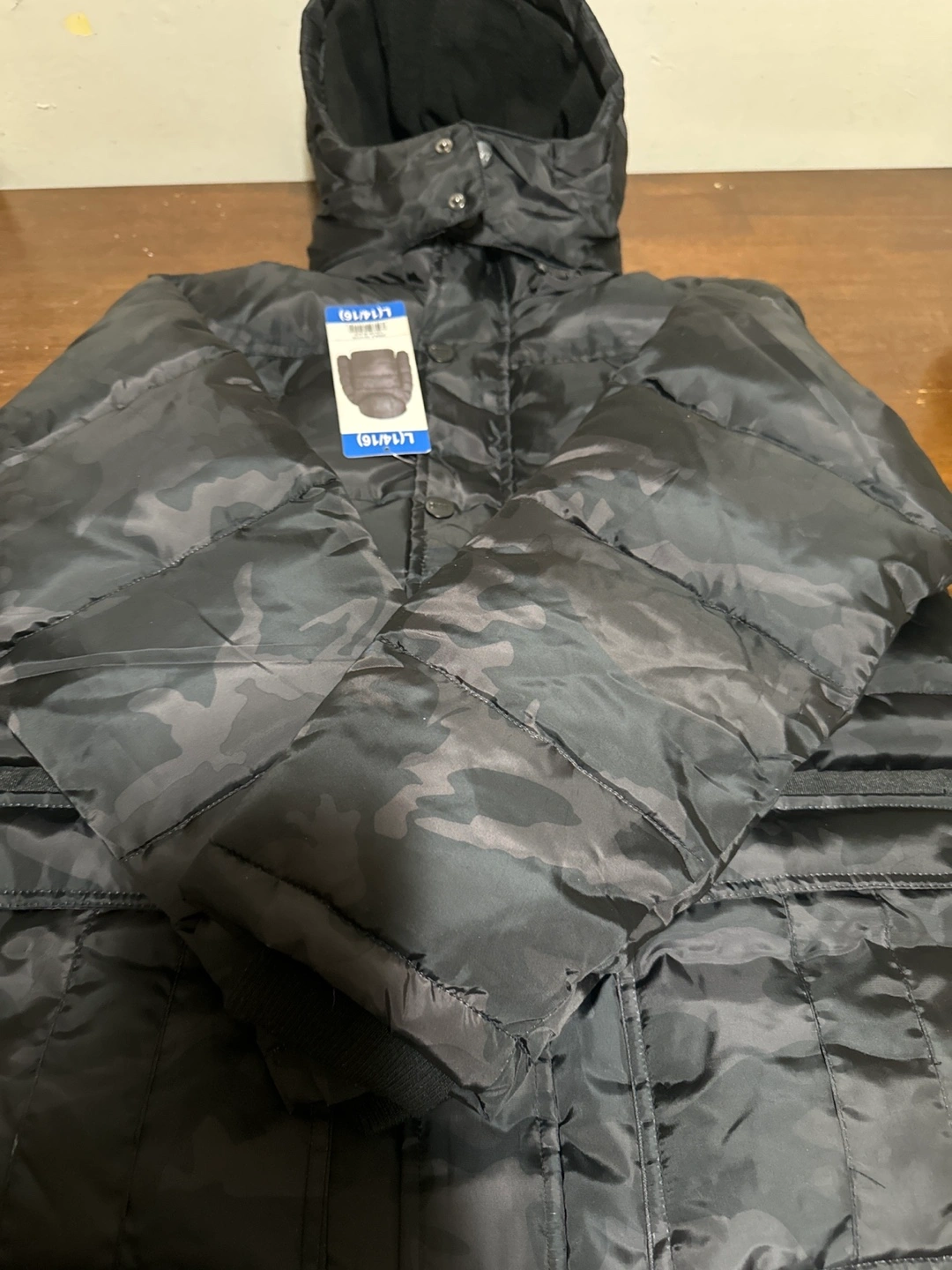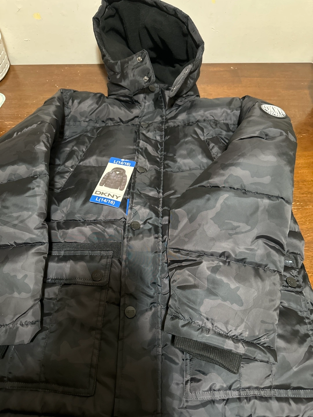 Black camo puffer jacket. Size large (14-16). Features a hood and pockets. New with tags.