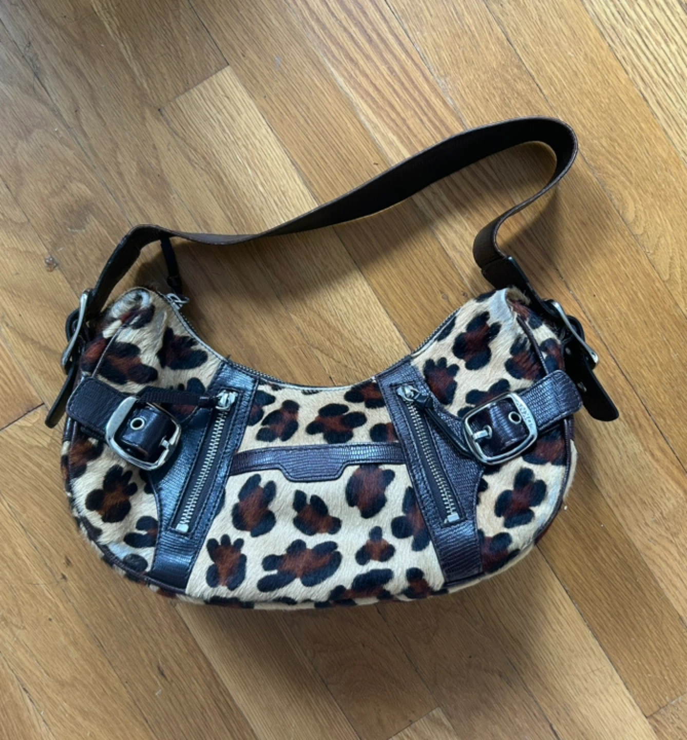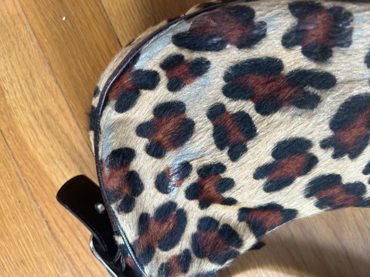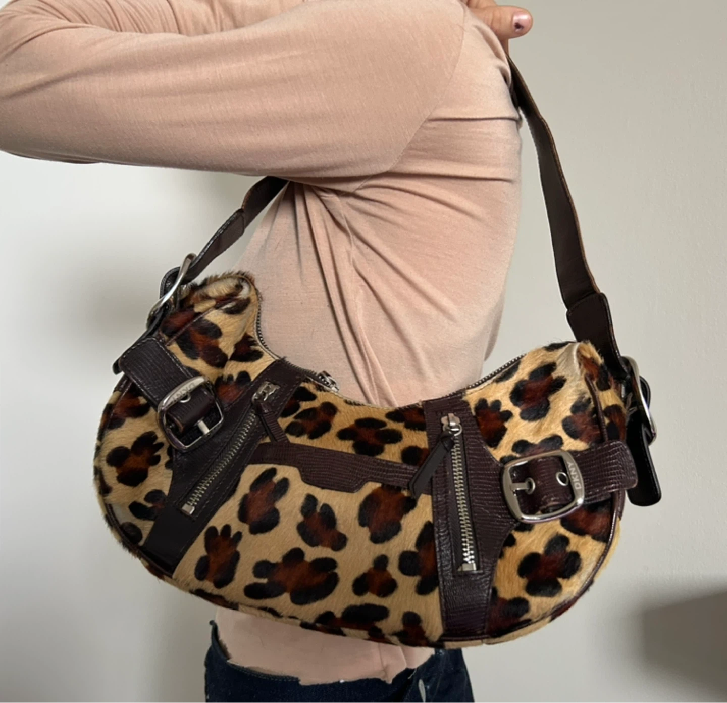 DKNY shoulder bag with a fun leopard print. It has a unique shape and stylish details like buckle accents and zipper embellishments. Perfect for adding a touch of wildness to your outfit! It’s from 2003, so it has a bit of worn part as in one of the photos.