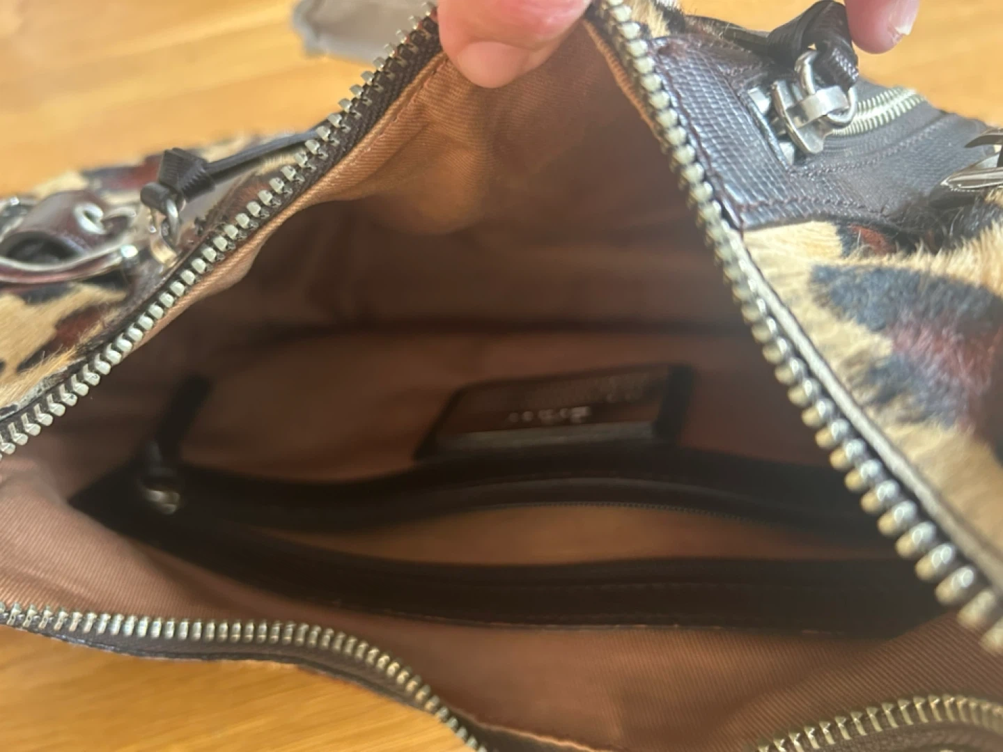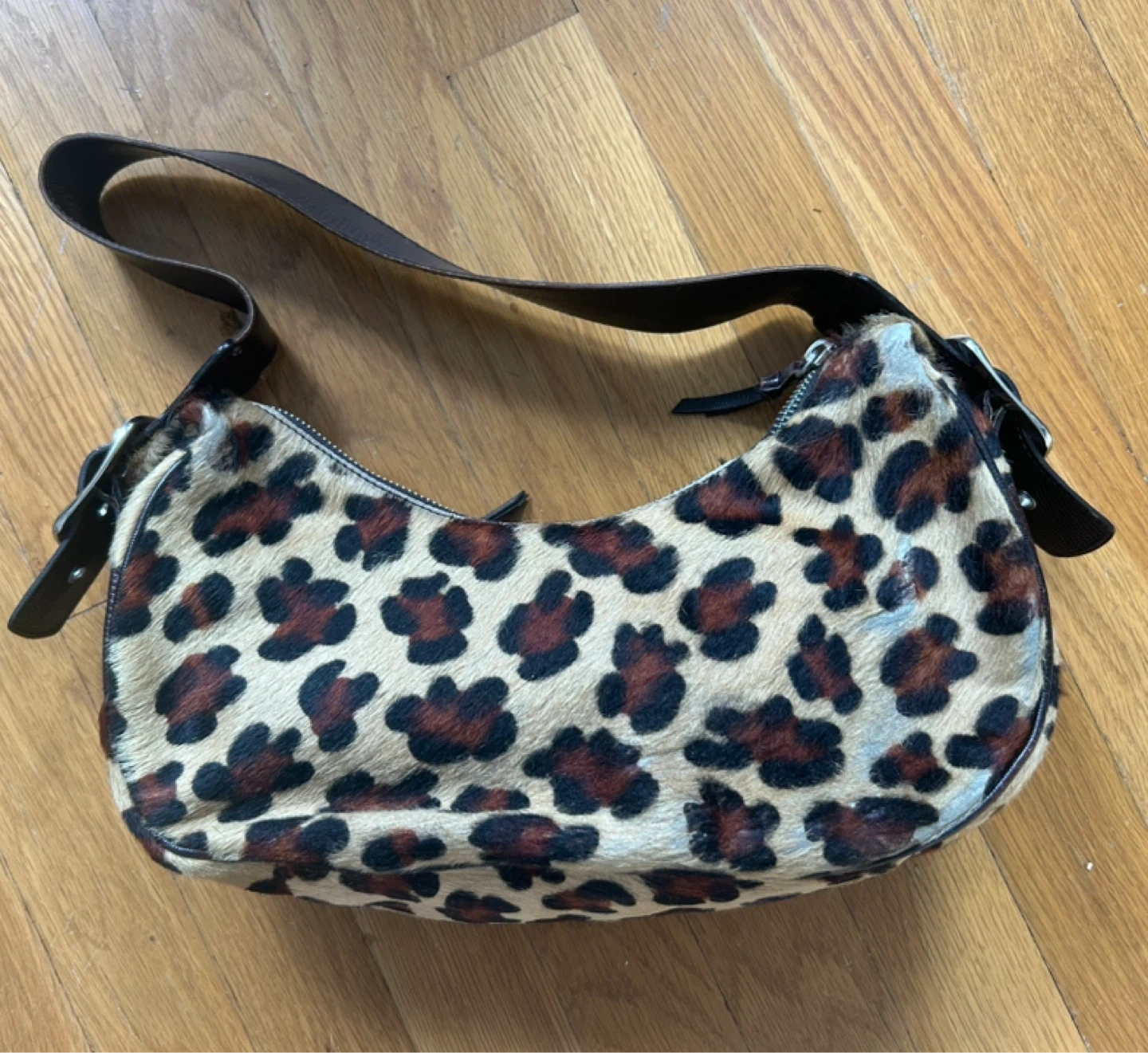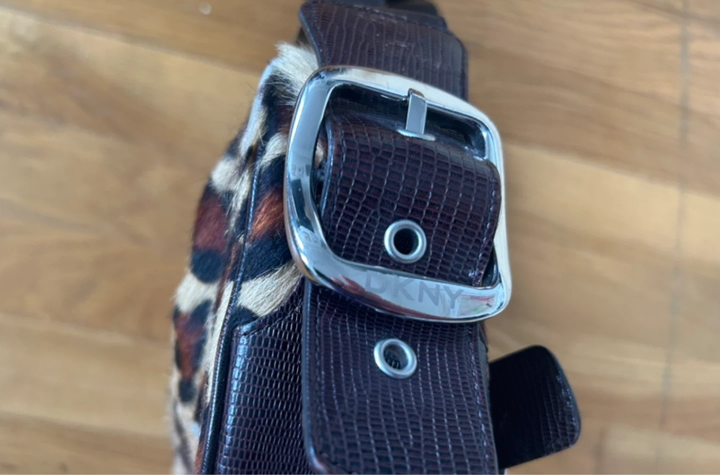 DKNY shoulder bag with a fun leopard print. It has a unique shape and stylish details like buckle accents and zipper embellishments. Perfect for adding a touch of wildness to your outfit! It’s from 2003, so it has a bit of worn part as in one of the photos.