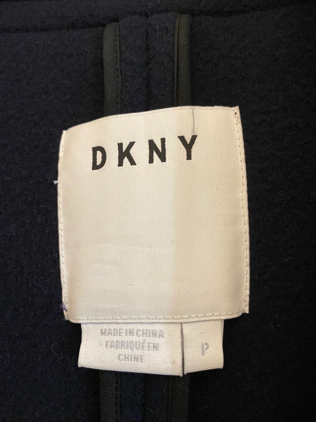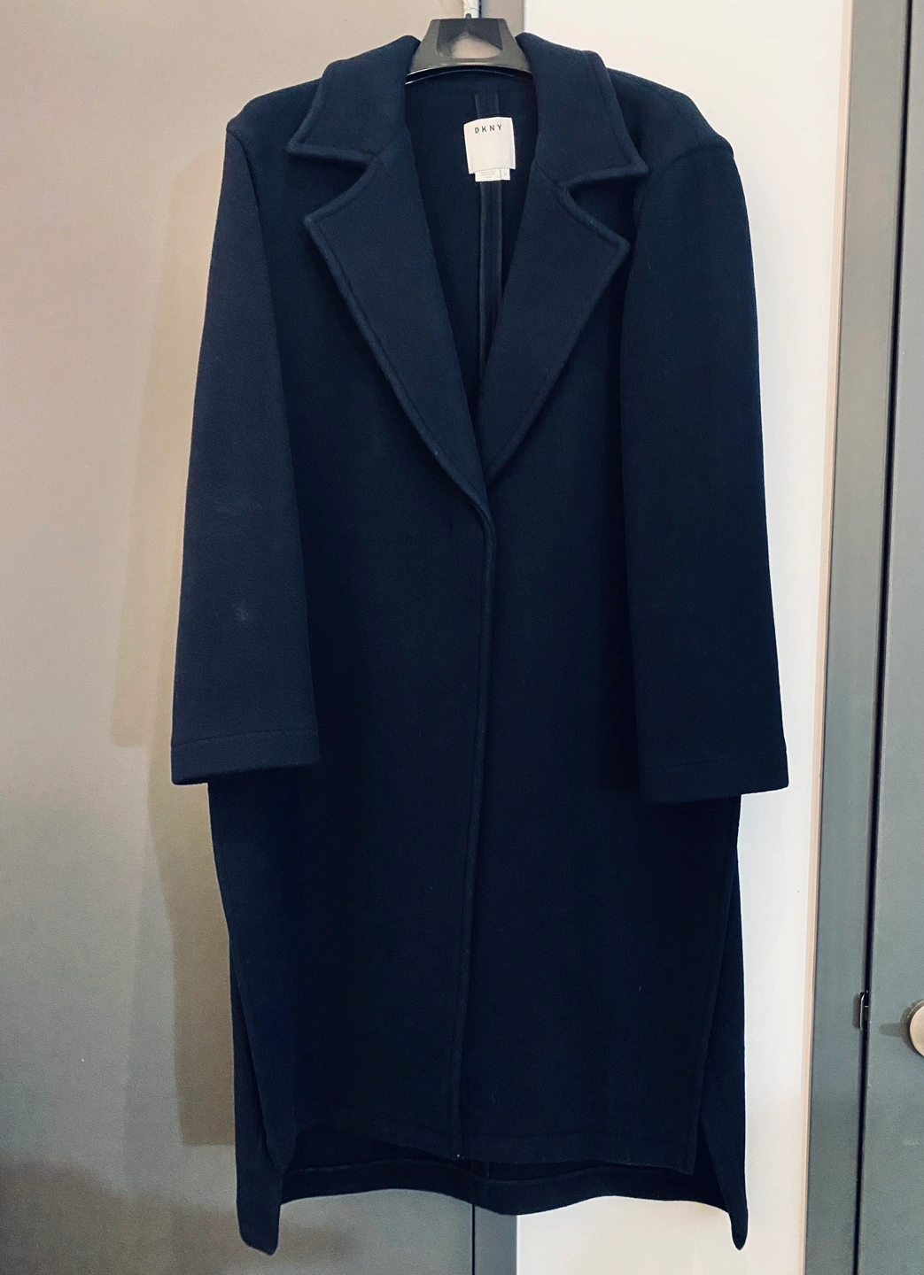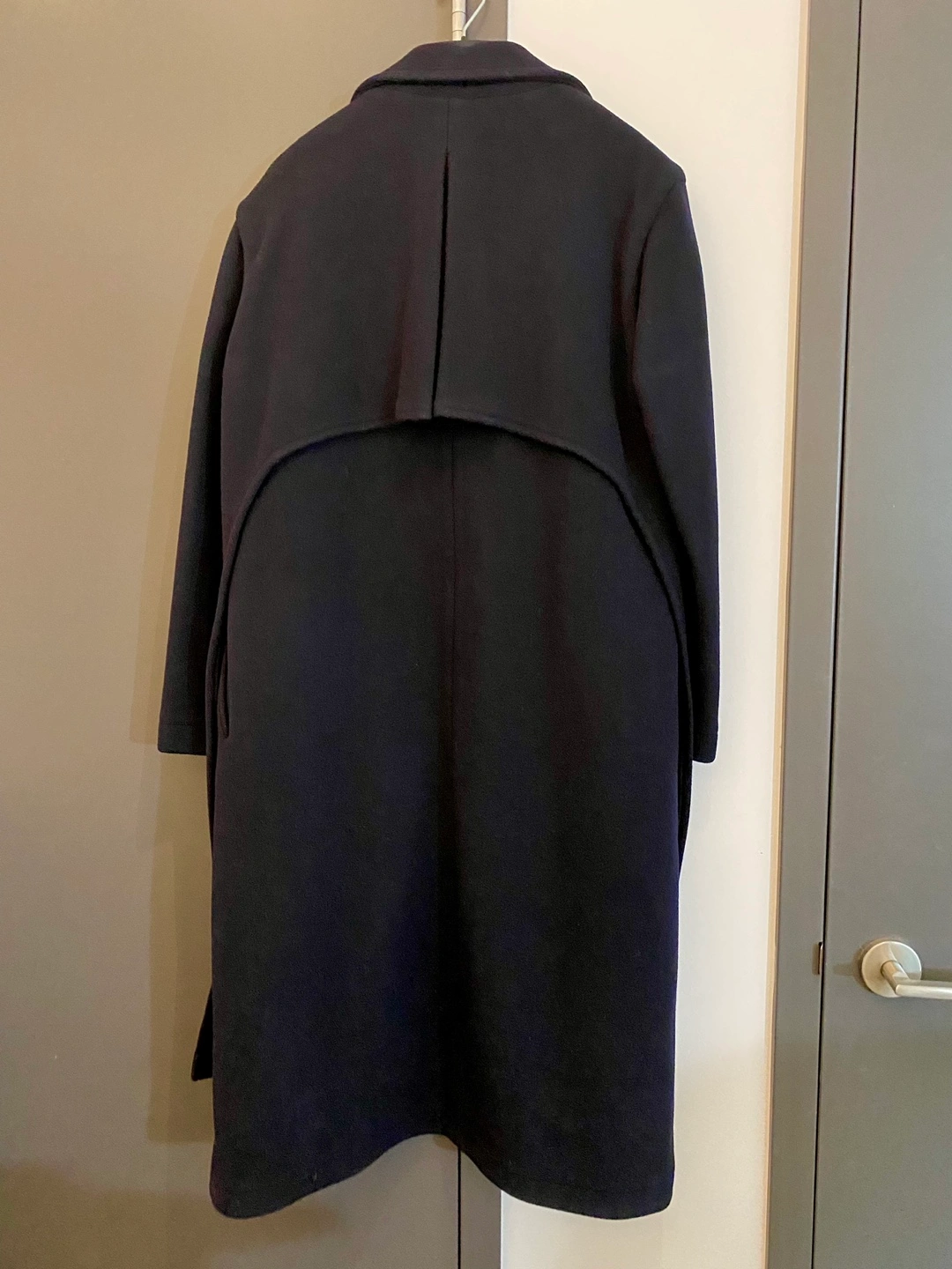 Navy blue coat with a front closure. The coat has a unique design with a high collar and a gathered back. Wool , in great condition, Worn twice Size L Pickup and cash only