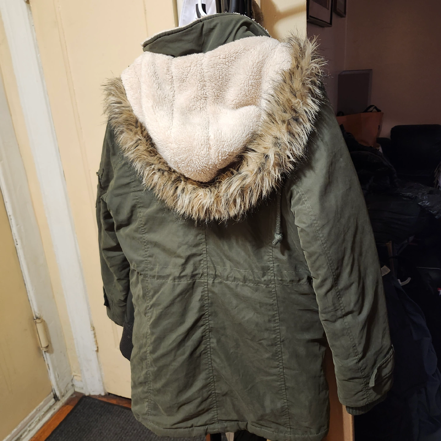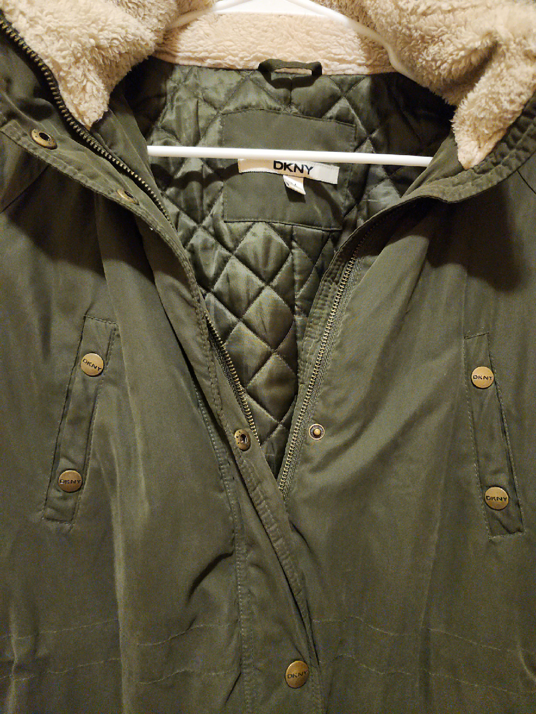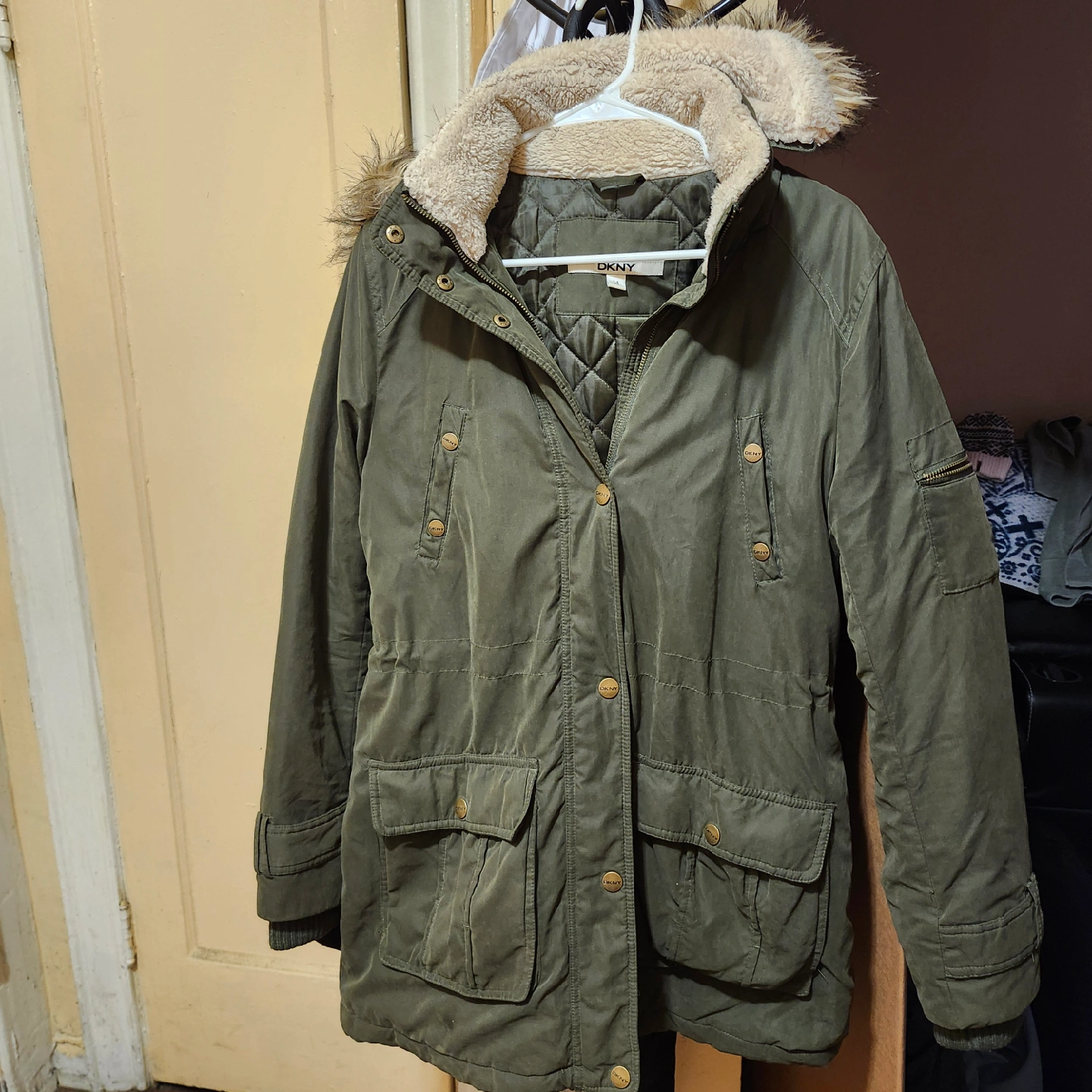 60Selling a DKNY winter parka in olive green! It's a size large and features a faux fur trim on the hood. The inside is quilted for extra warmth, perfect for those cold days
