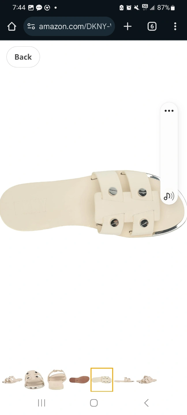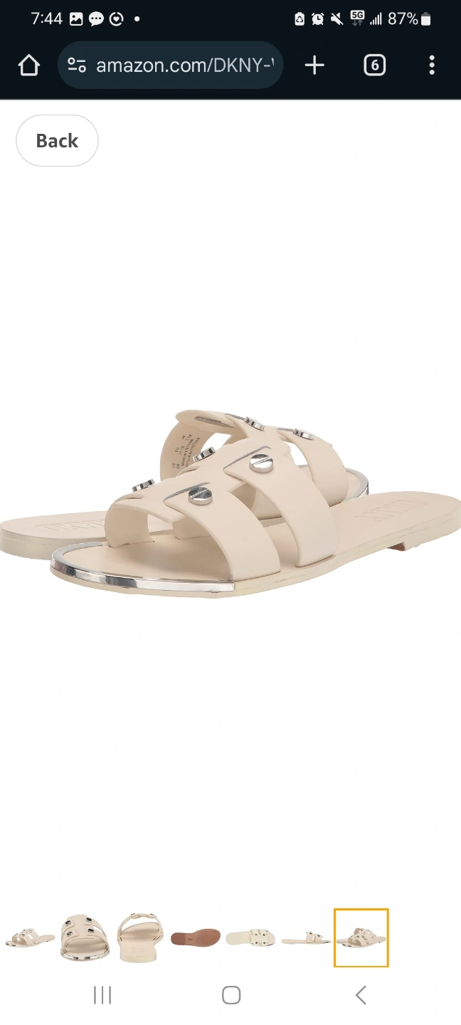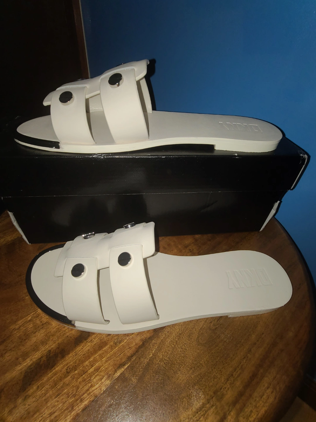 Cream-colored leather slides. Metal studs detail. Silver-toned accents. Open-toe design. Comfortable summer footwear.