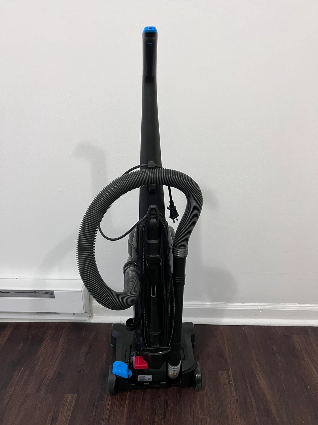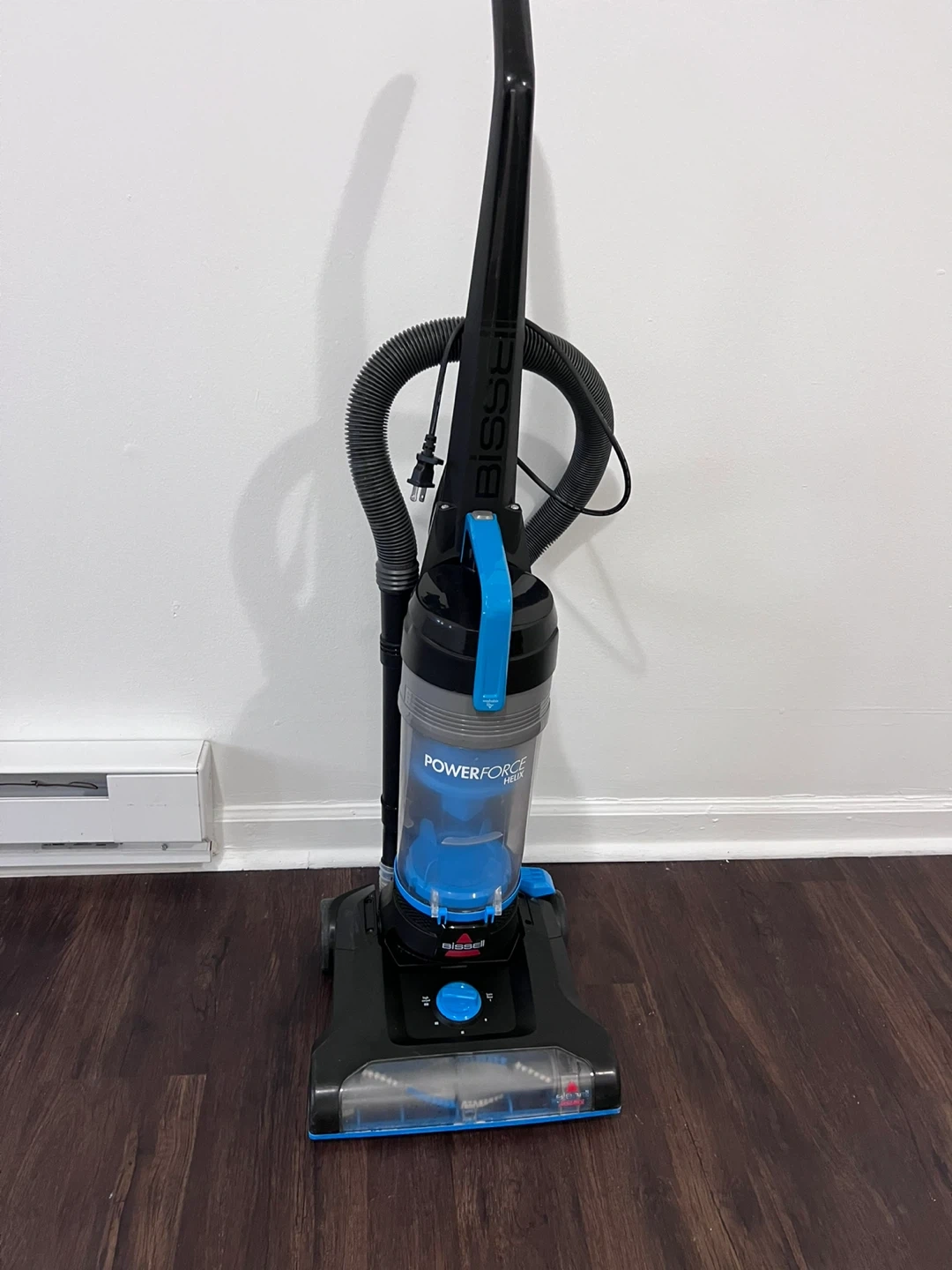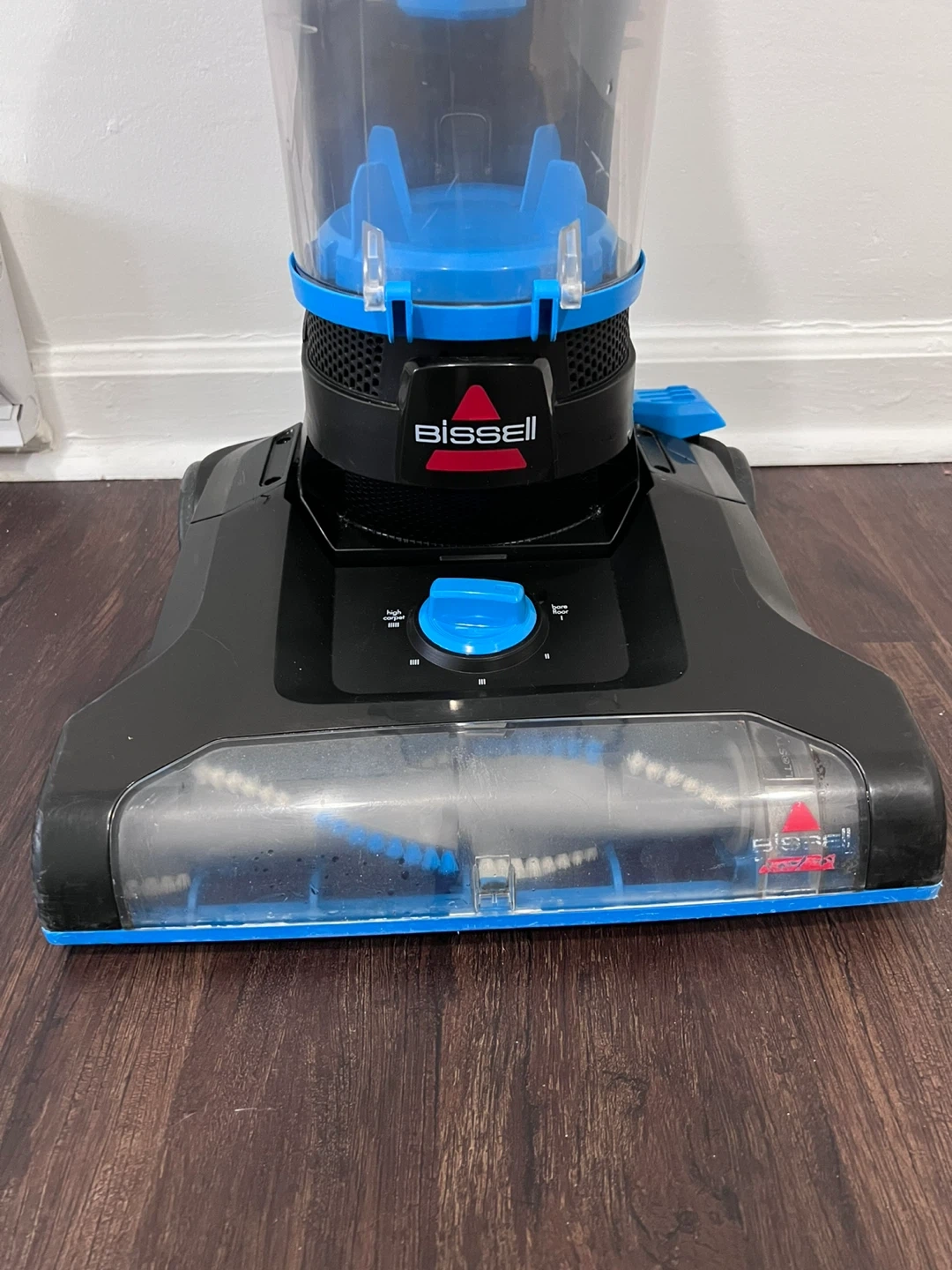 Bissell upright vacuum cleaner with a powerful suction. Features a multi-surface brush roll for effective cleaning. Lightweight design with a cyclonic system for dirt separation.