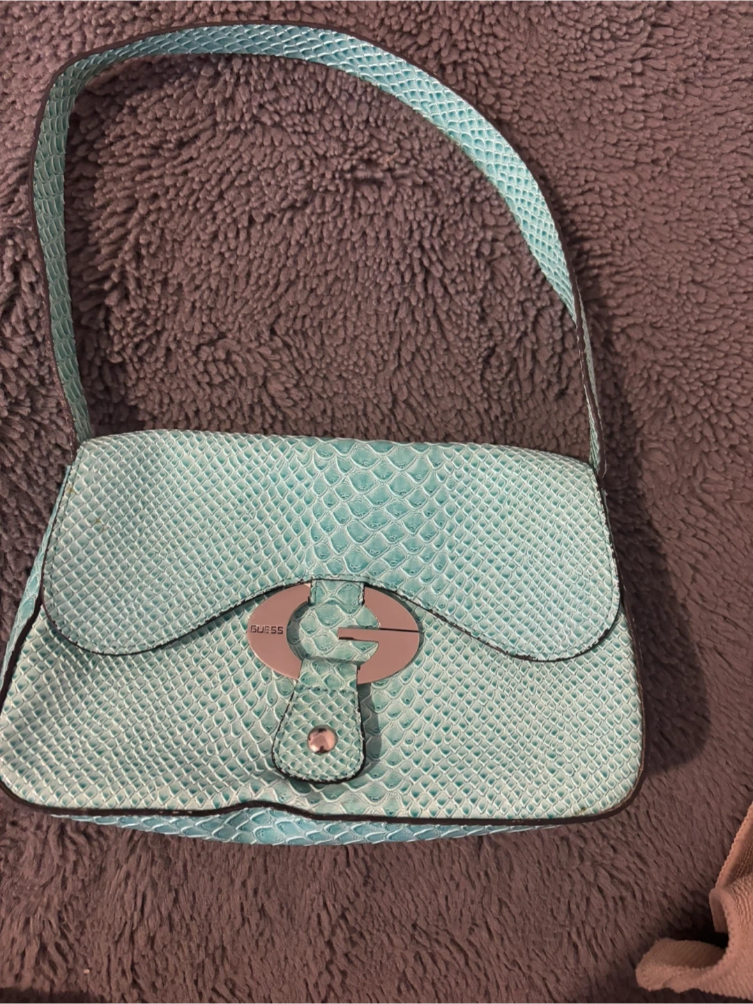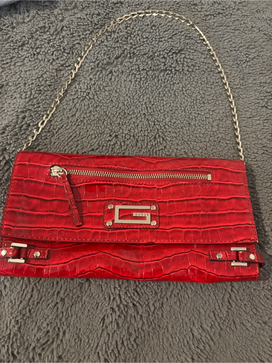 This Guess clutch wallet features a red croc-embossed exterior with a silver chain strap. It has a zippered pocket on the front and a main compartment with a zip-around closure. Plenty of space for cards and essentials!