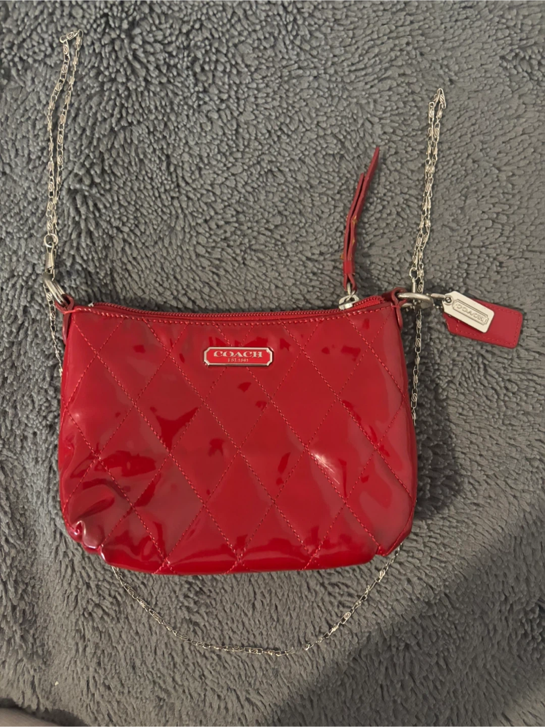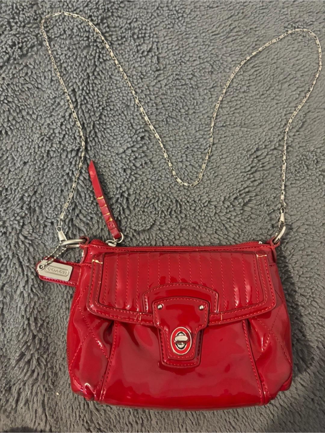 This Guess clutch wallet features a red croc-embossed exterior with a silver chain strap. It has a zippered pocket on the front and a main compartment with a zip-around closure. Plenty of space for cards and essentials!