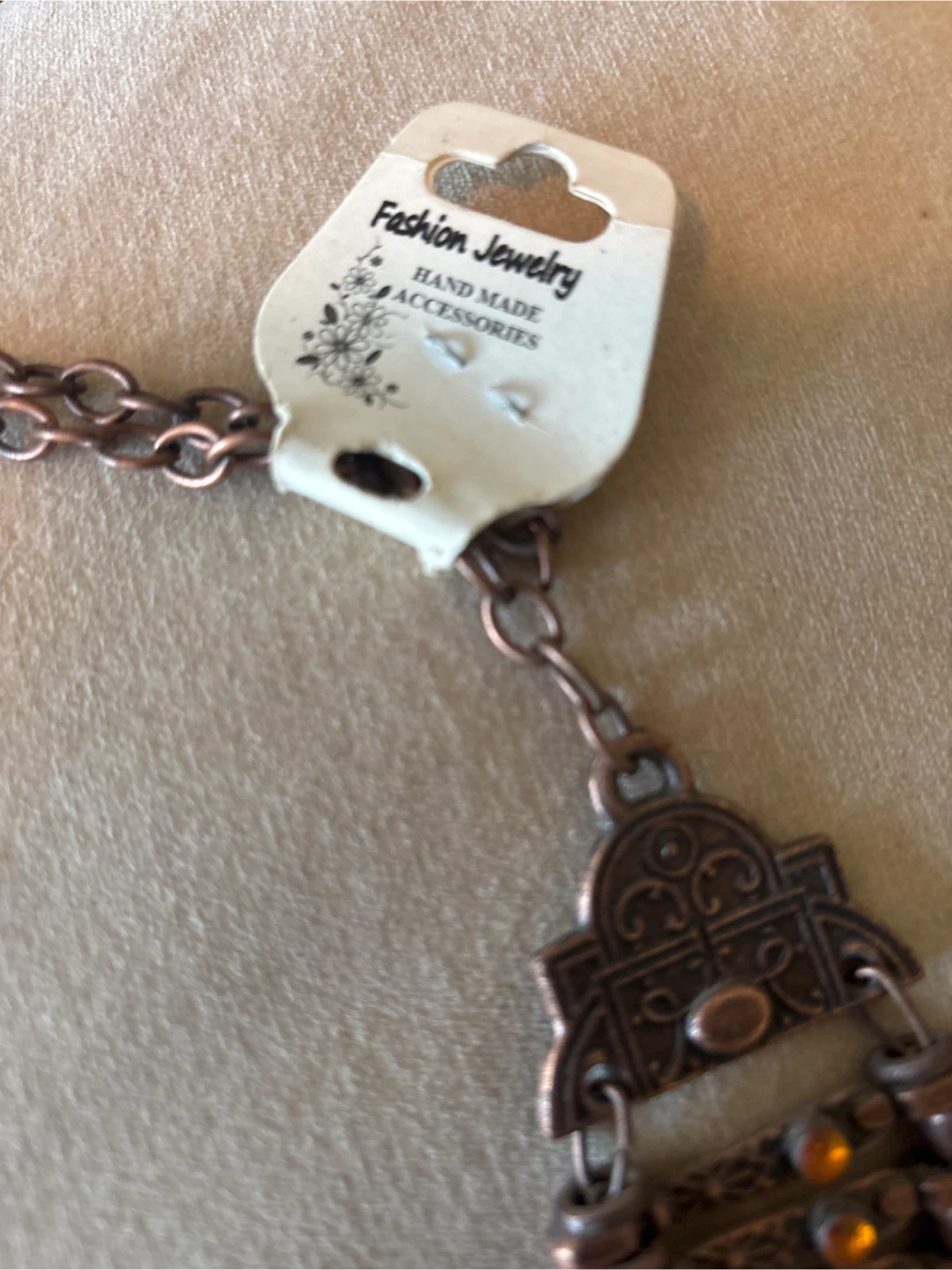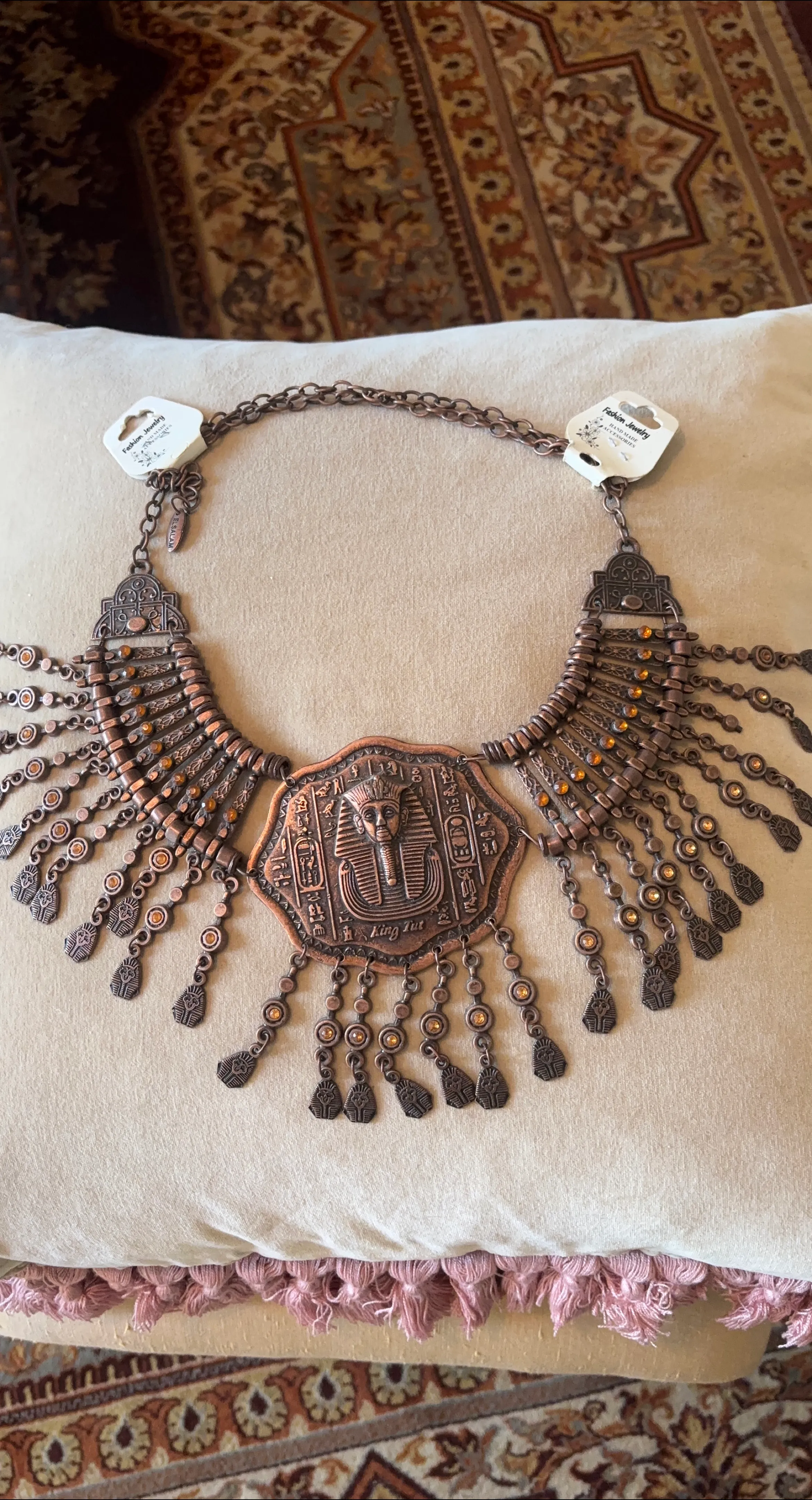 Unique statement necklace featuring a King Tut design! It has a bronze-like color with small yellow stones. Perfect for adding a bit of ancient Egyptian flair to any outfit- new with tags