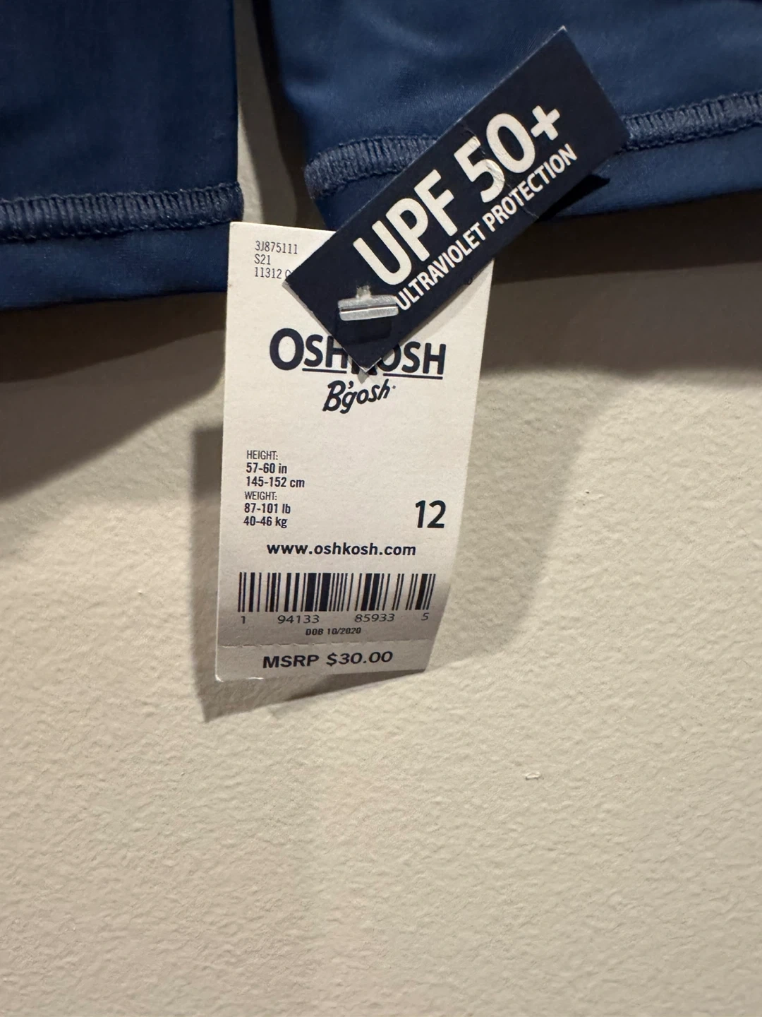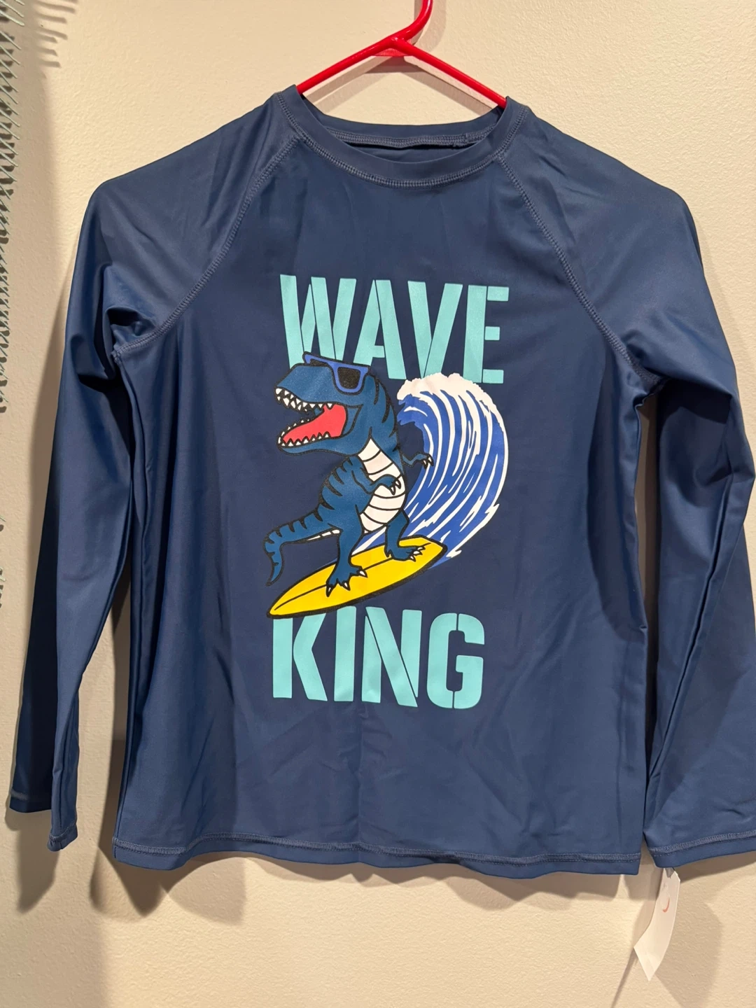 This OshKosh B'gosh rash guard features a fun "Wave King" dinosaur design. It's a size 12 and made of 83% polyester and 17% elastane. The rash guard also has UPF 50+ ultraviolet protection. Originally bought for $30!
