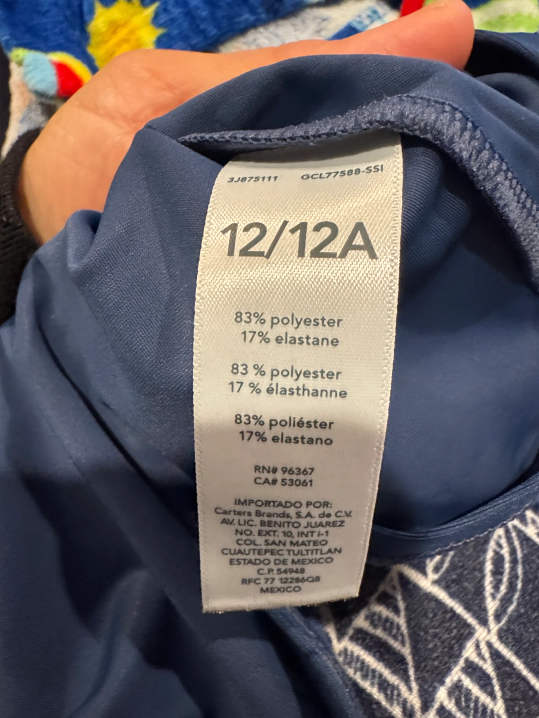 This OshKosh B'gosh rash guard features a fun "Wave King" dinosaur design. It's a size 12 and made of 83% polyester and 17% elastane. The rash guard also has UPF 50+ ultraviolet protection. Originally bought for $30!