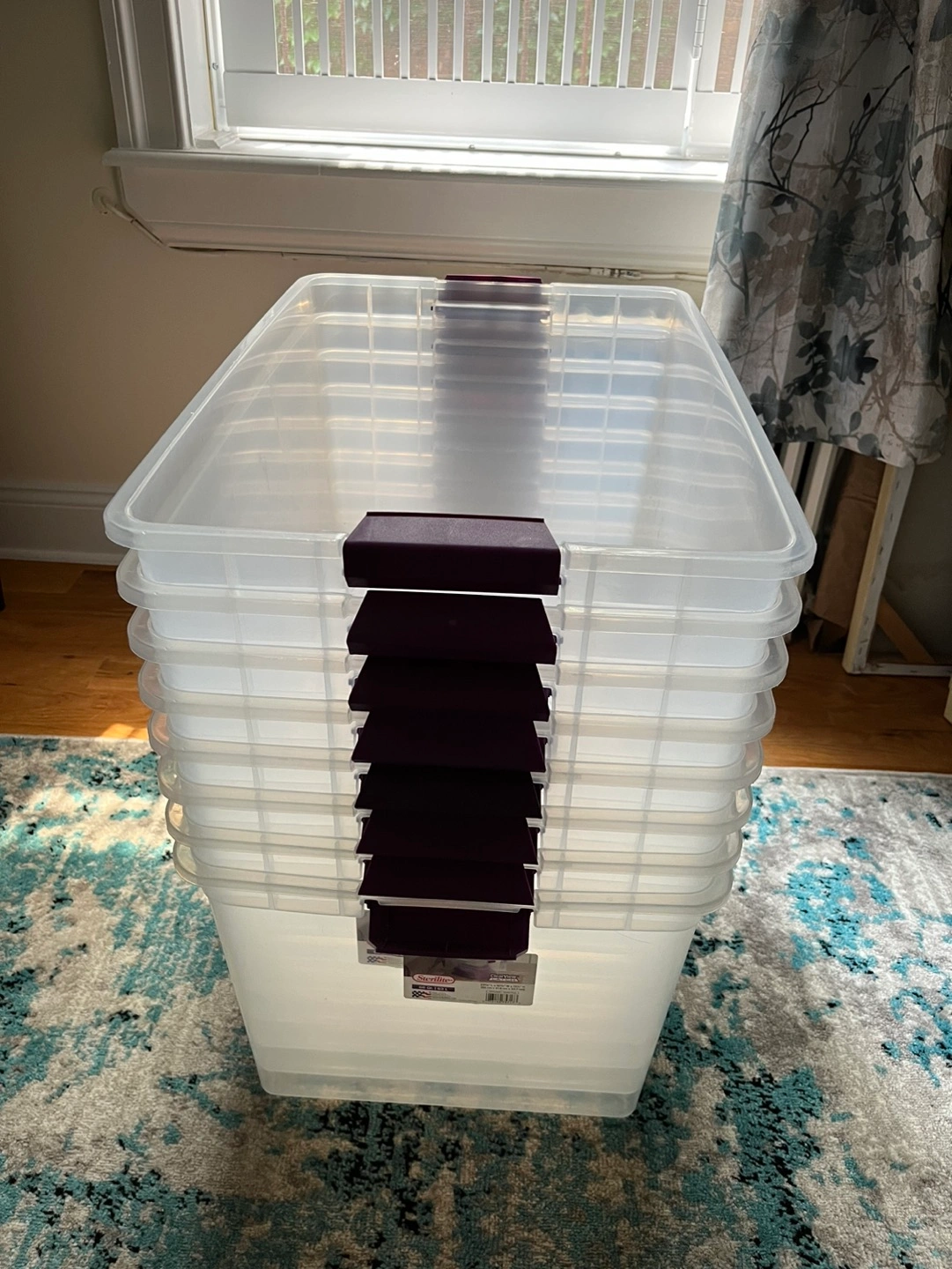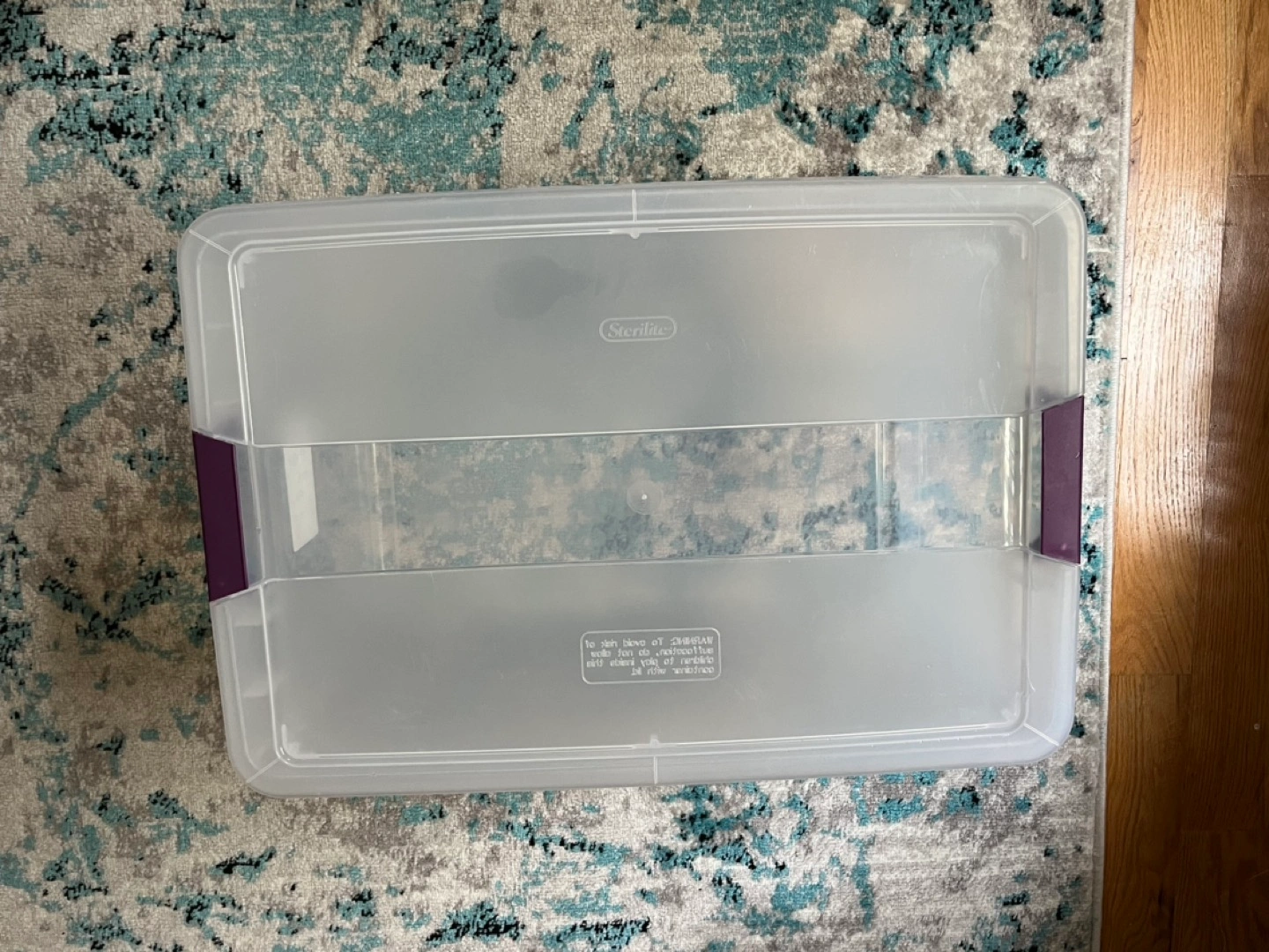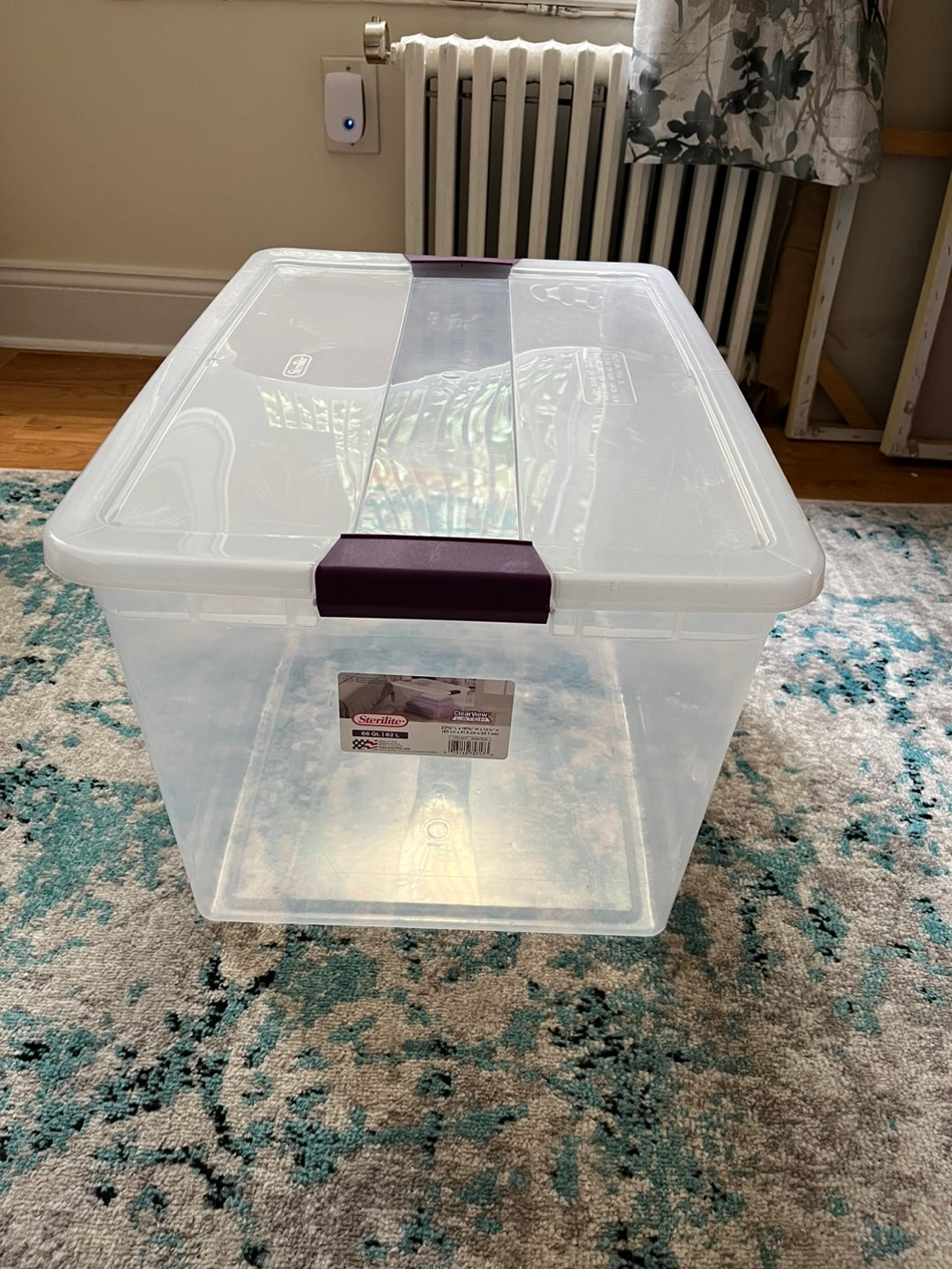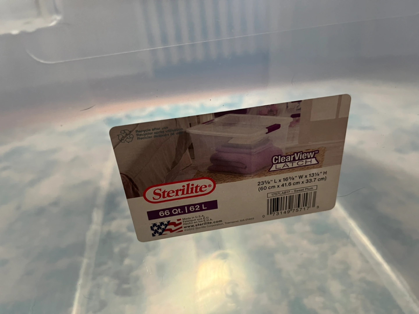 66 qt Sterilite plastic storage bin with lid. Dimensions are: 23 5/8" long, 16 3/8" wide, 13 1/4" tall. Quantity of 8 available, $8 each.