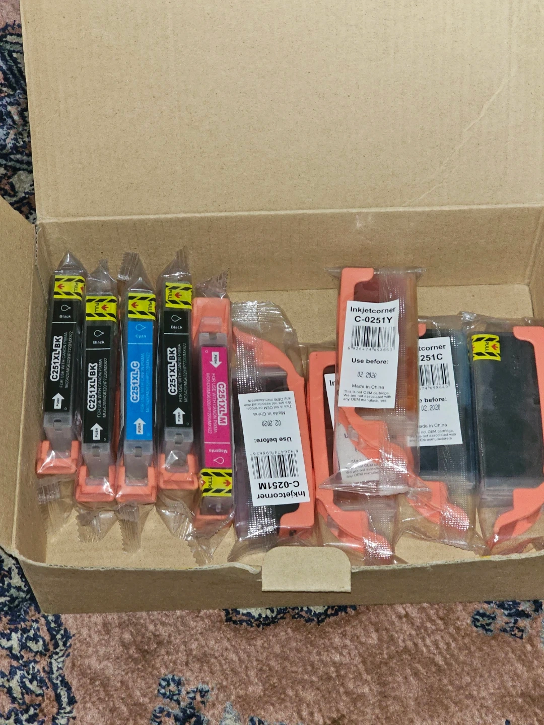 Selling a complete set of Inkjetcorner non-OEM compatible ink cartridges. This 20-pack includes 4 black, 4 cyan, 4 magenta, and 4 yellow cartridges. The cartridges are compatible with PGI-250XL/CLI-251XL printers. Expire December 2018