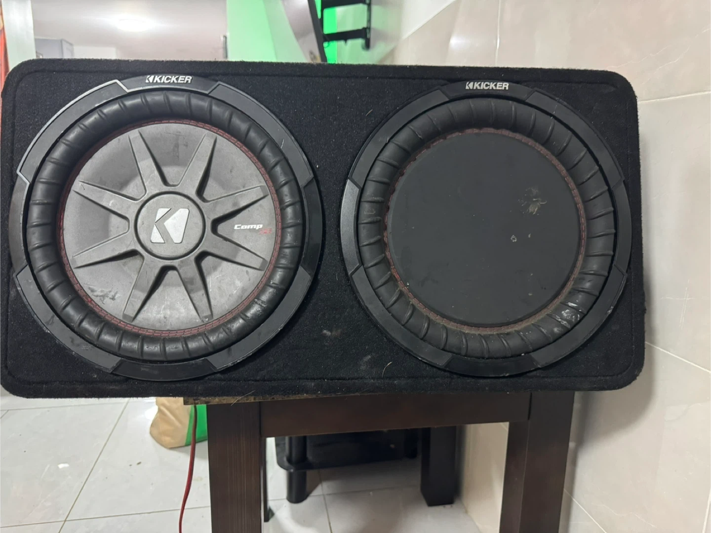 This is a Kicker Comp dual 12-inch subwoofer enclosure. It's carpeted and includes two subwoofers. Great for adding bass to your car audio system!