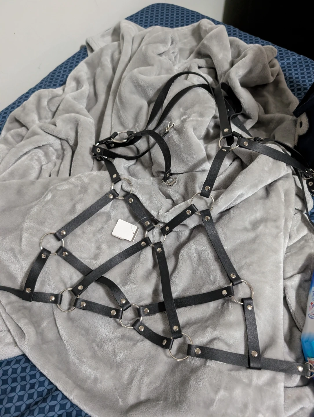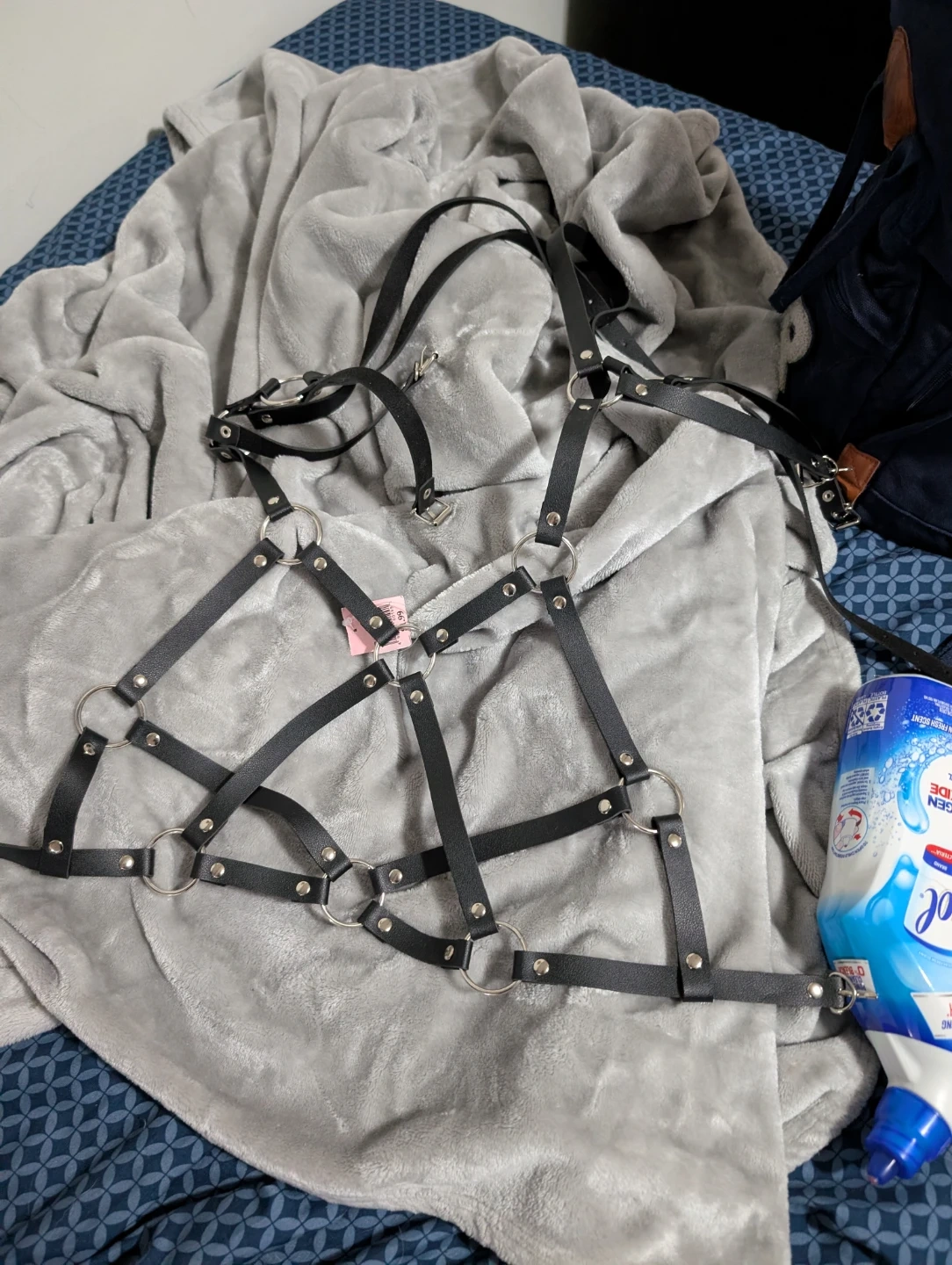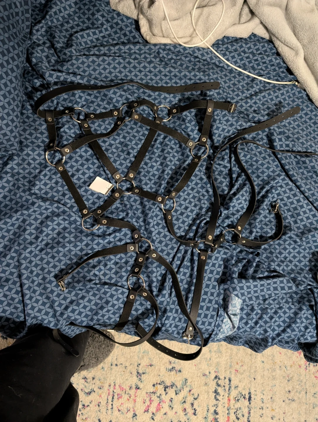 This is a black body harness with multiple straps and silver O-ring details. It's adjustable for a custom fit. It offers a unique aesthetic for styling.