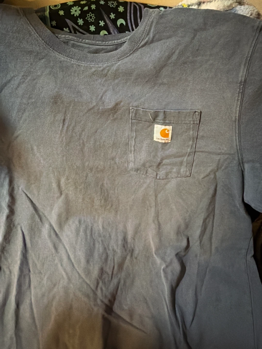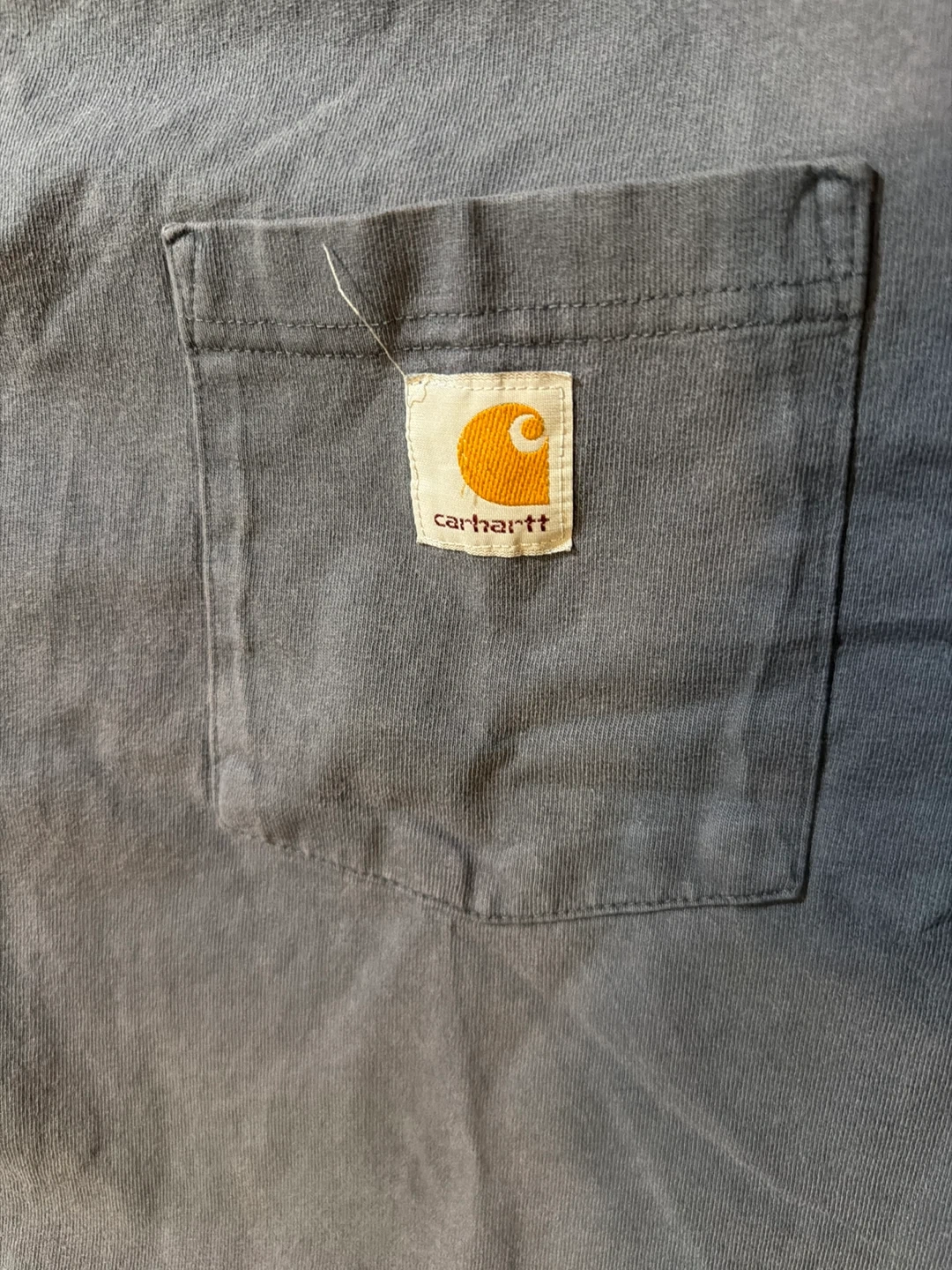 Classic Carhartt pocket t-shirt in a faded grey color. Soft cotton construction for everyday wear. Chest pocket with signature Carhartt logo patch. This shirt's durable build makes it a go-to for work or casual outings.