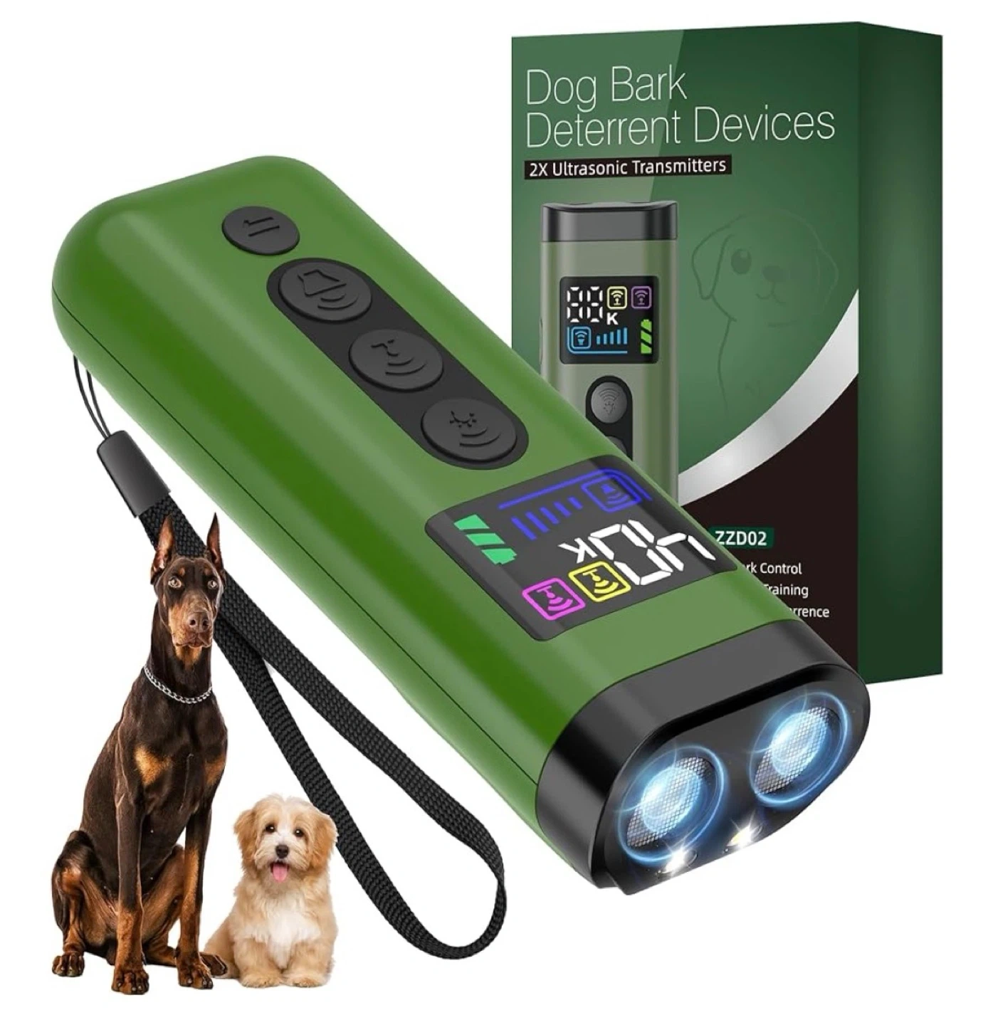 Selling a dog bark deterrent device with 2X ultrasonic transmitters. It's great for bark control and training. The model number is ZZD02. Comes with the original box
