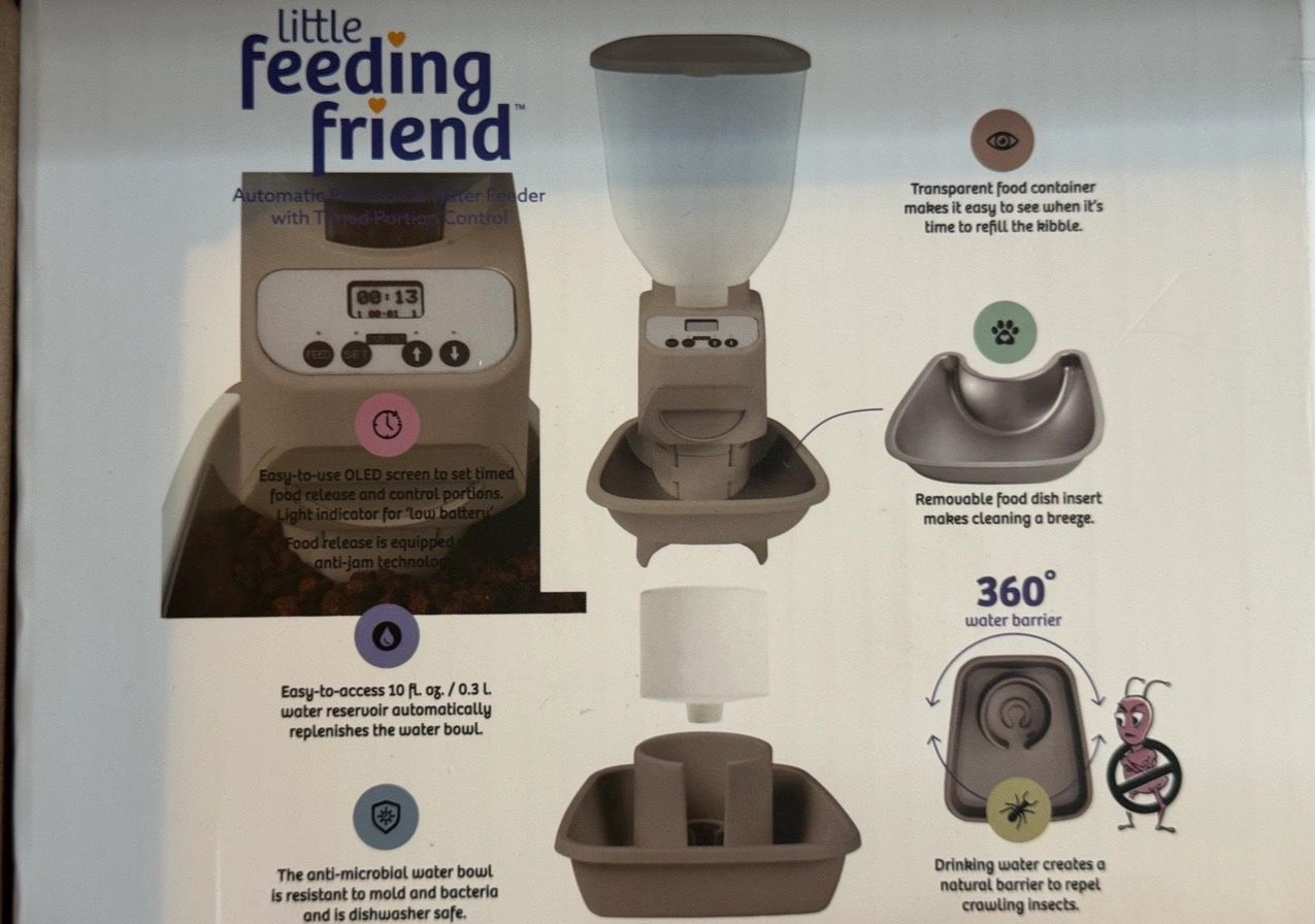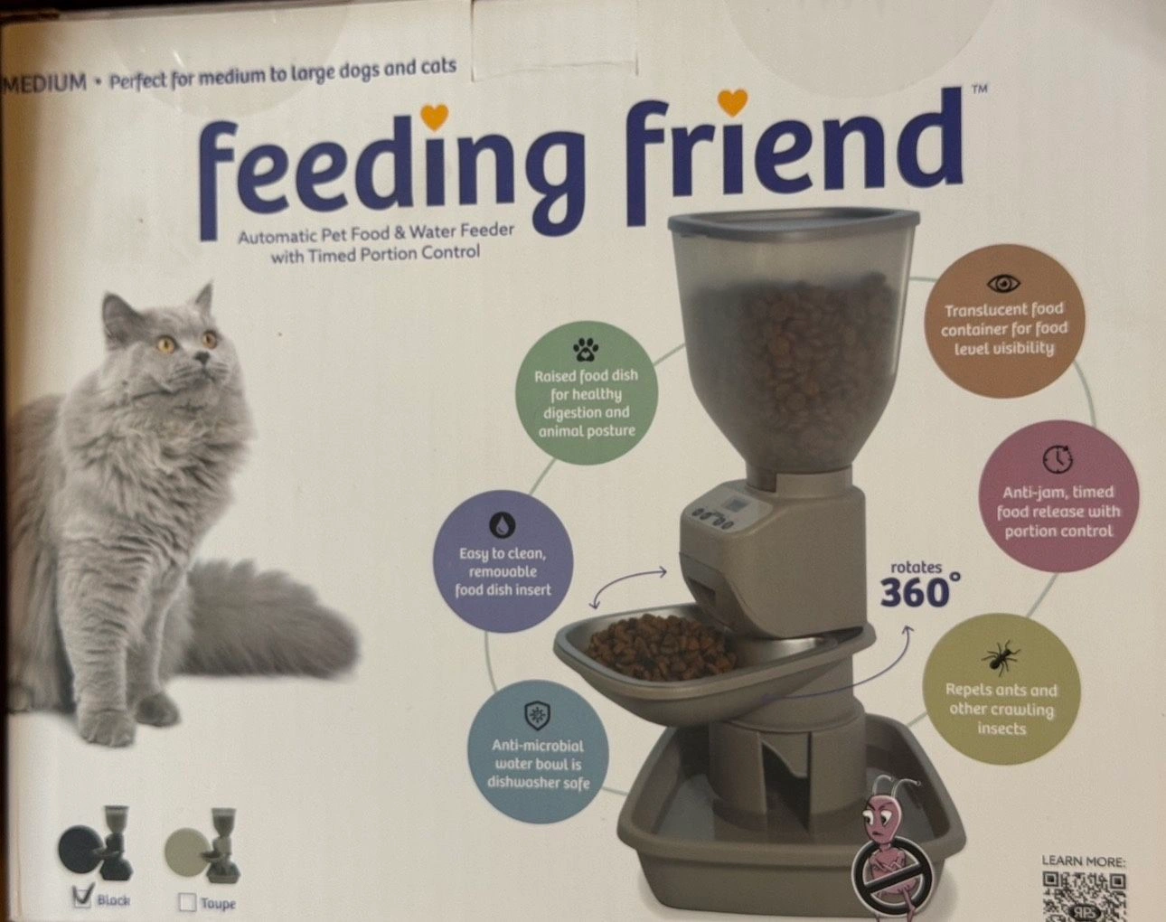 25Automatic Dog & Cat Food Feeder with Water Dispenser – Smart Pet Feeder with Portion Control, OLED Display, Anti Jam Design, Battery Operated Dispenser for Pets 2 sizes available: Small - (1) Black & (1) Taupe $80 each Medium size - (1) Black $100 This automatic pet feeder is perfect for medium to large dogs and cats! It features a translucent food container for easy food level visibility, a raised food dish for healthy digestion, and an anti-microbial water bowl that is dishwasher safe. It also rotates 360 degrees and has an anti-jam, timed food release with portion control. The feeder is designed to repel ants and other crawling insects. Dishwasher safe! Features: BPA-free, Programmable, Flow control, Water filtration, Dishwasher safe, Non-spill Color: Black Animal: Dog