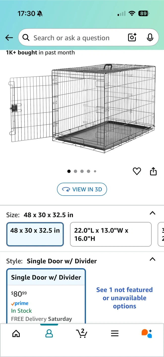 Selling a dog crate, sized at 48 x 30 x 32.5 inches. It's a single door style with a divider. Perfect for your furry friend!