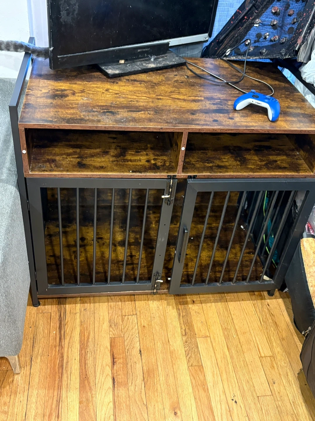 65Selling a dog crate end table. It has a wood top and metal bars. Great for small to medium sized dogs need gone soon move