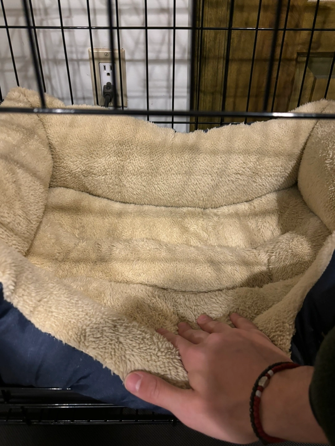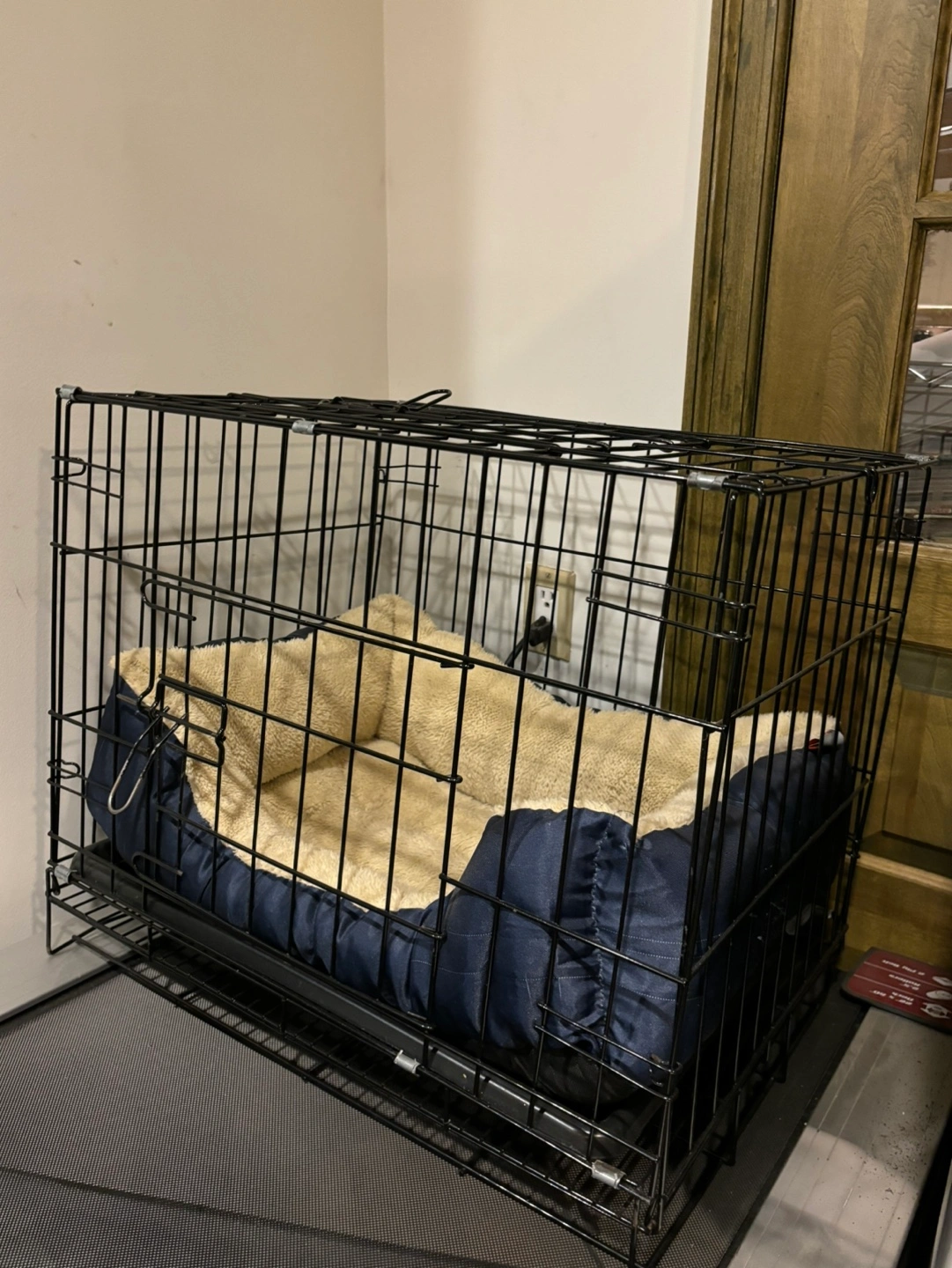 Black metal dog crate with a blue outlined and a fluffy interior bed. Last pic is my 7lb miniature schnauzer inside for reference.