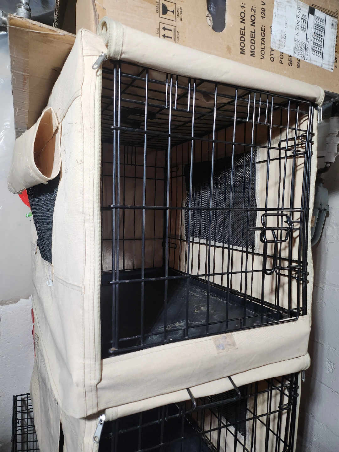 5Selling a dog crate that comes with a cover! The cover is a light beige color. The crate itself is black. The box has 'Model NO.1' and 'Model NO.2' printed on it. Perfect for your furry friend!