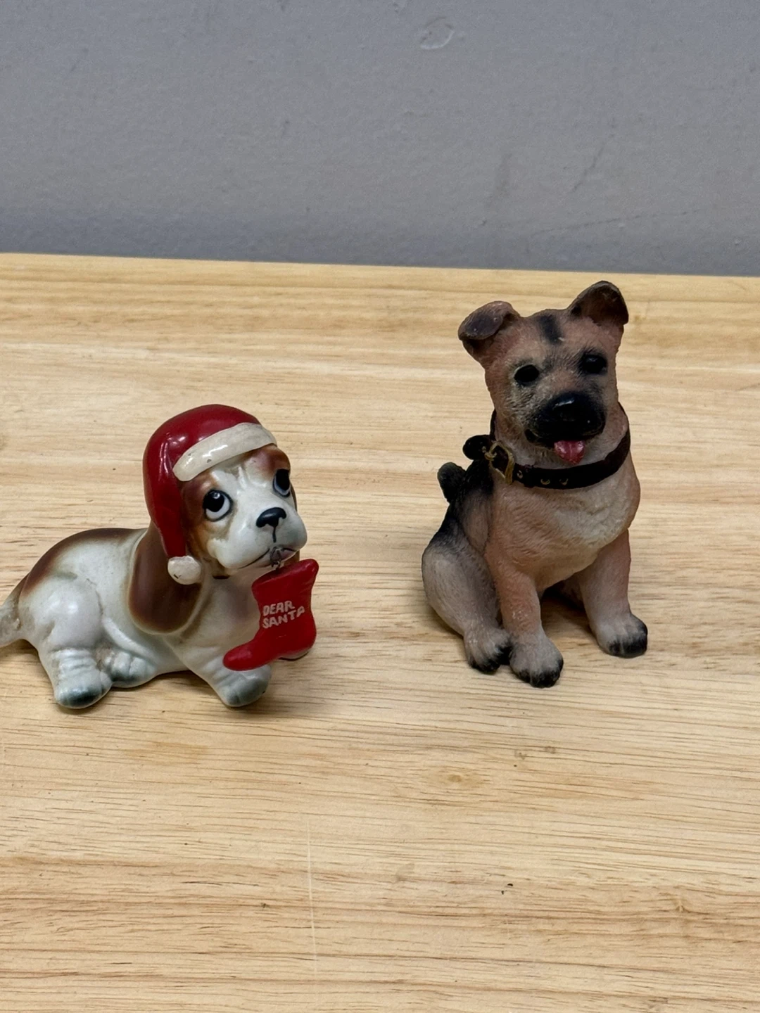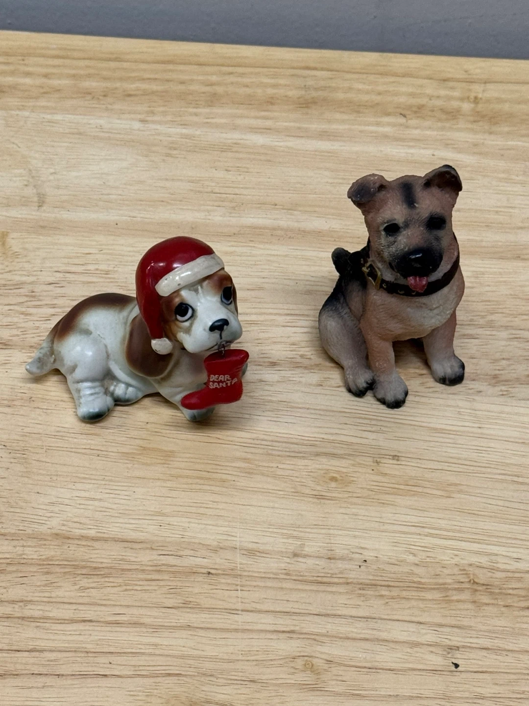 Selling a set of two cute dog figurines! One is wearing a Santa hat and holding a stocking that says 'Dear Santa', and the other is a tan and black dog with a collar. They're both in great condition and would make a charming addition to any collection or decor