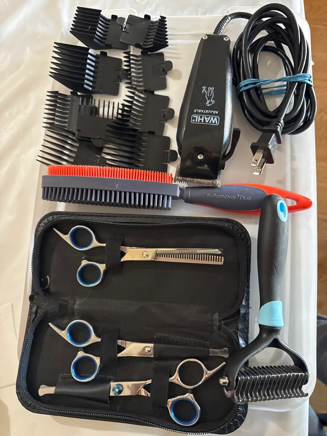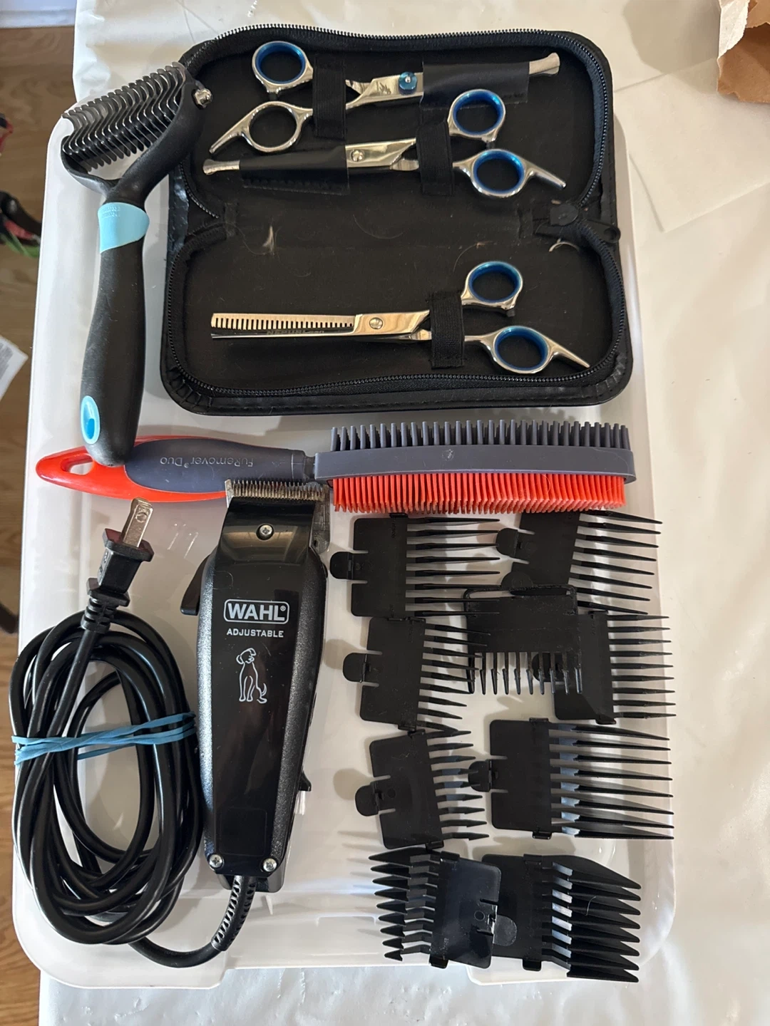 28Selling a complete dog grooming kit! It includes a Wahl adjustable clipper, various brushes, and scissors for all your grooming needs. Perfect for keeping your furry friend looking their best!