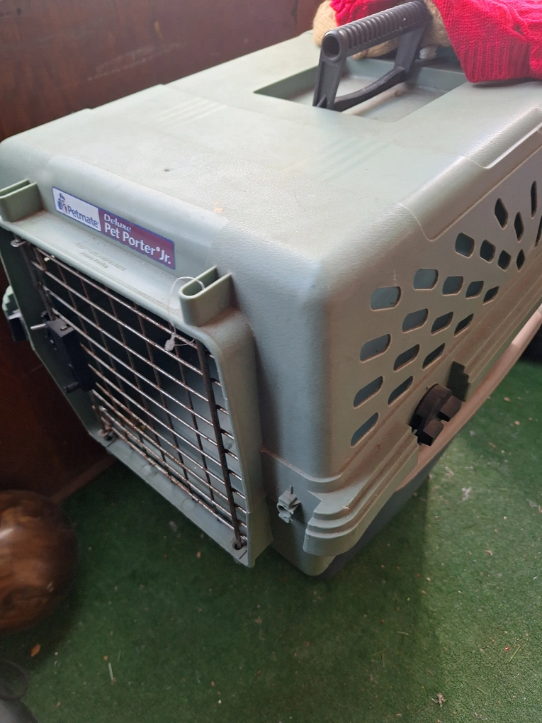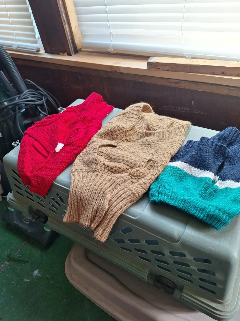 25Selling a set of three adorable dog sweaters! One is a solid red, another is a tan knit, and the third is blue with a teal stripe. All are in great condition and appear to be a small size. Perfect for keeping your furry friend warm and stylish! also selling pet carrier for small dogs or cats. like new