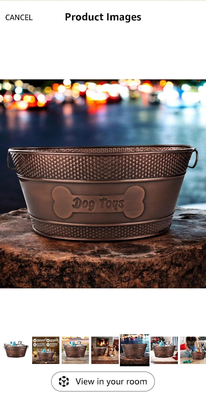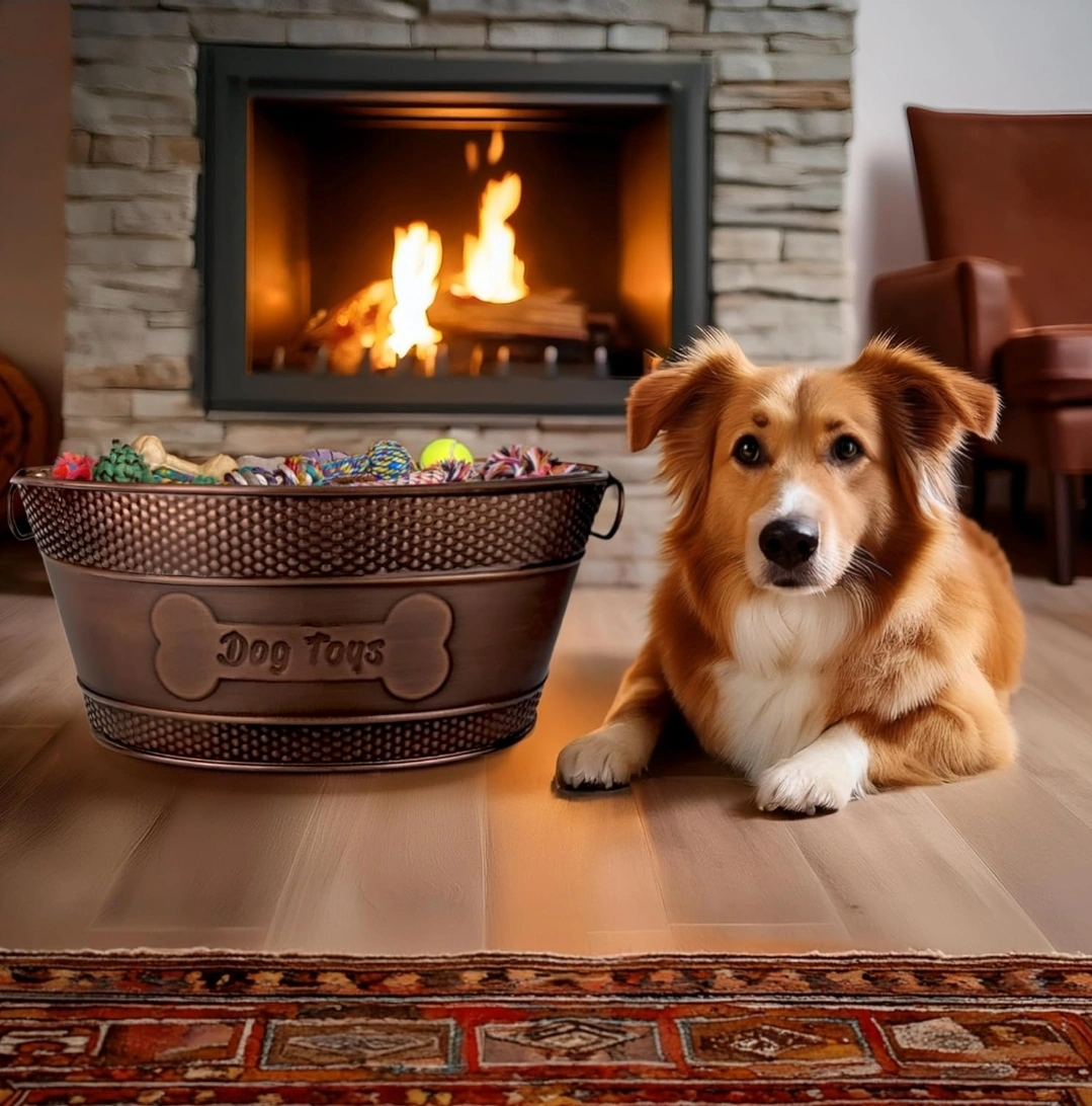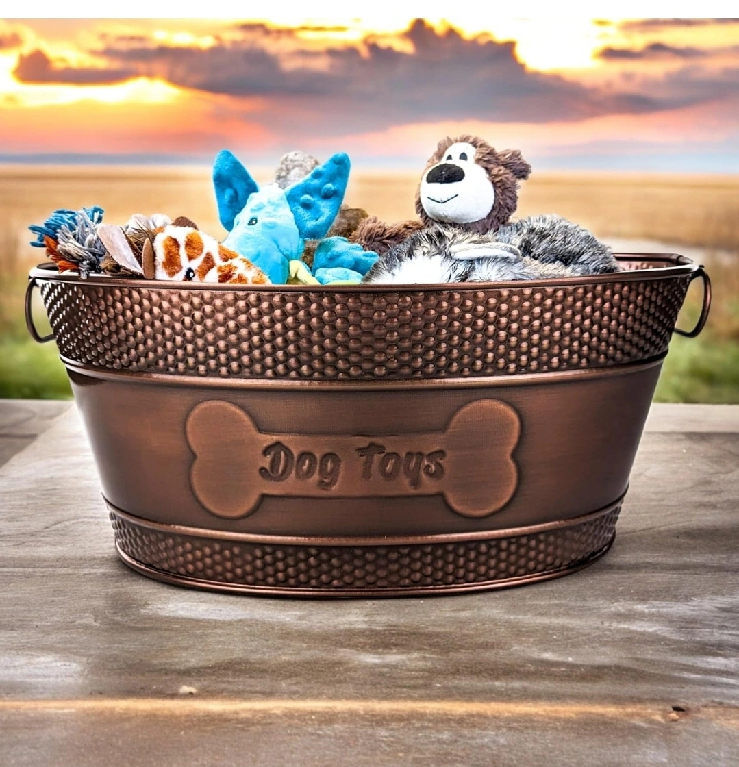 This bronze-finished dog toy storage bin is perfect for keeping your pup's toys organized! It features a cute bone design and 'Dog Toys' text on the front. It's a stylish and practical addition to any pet-friendly home