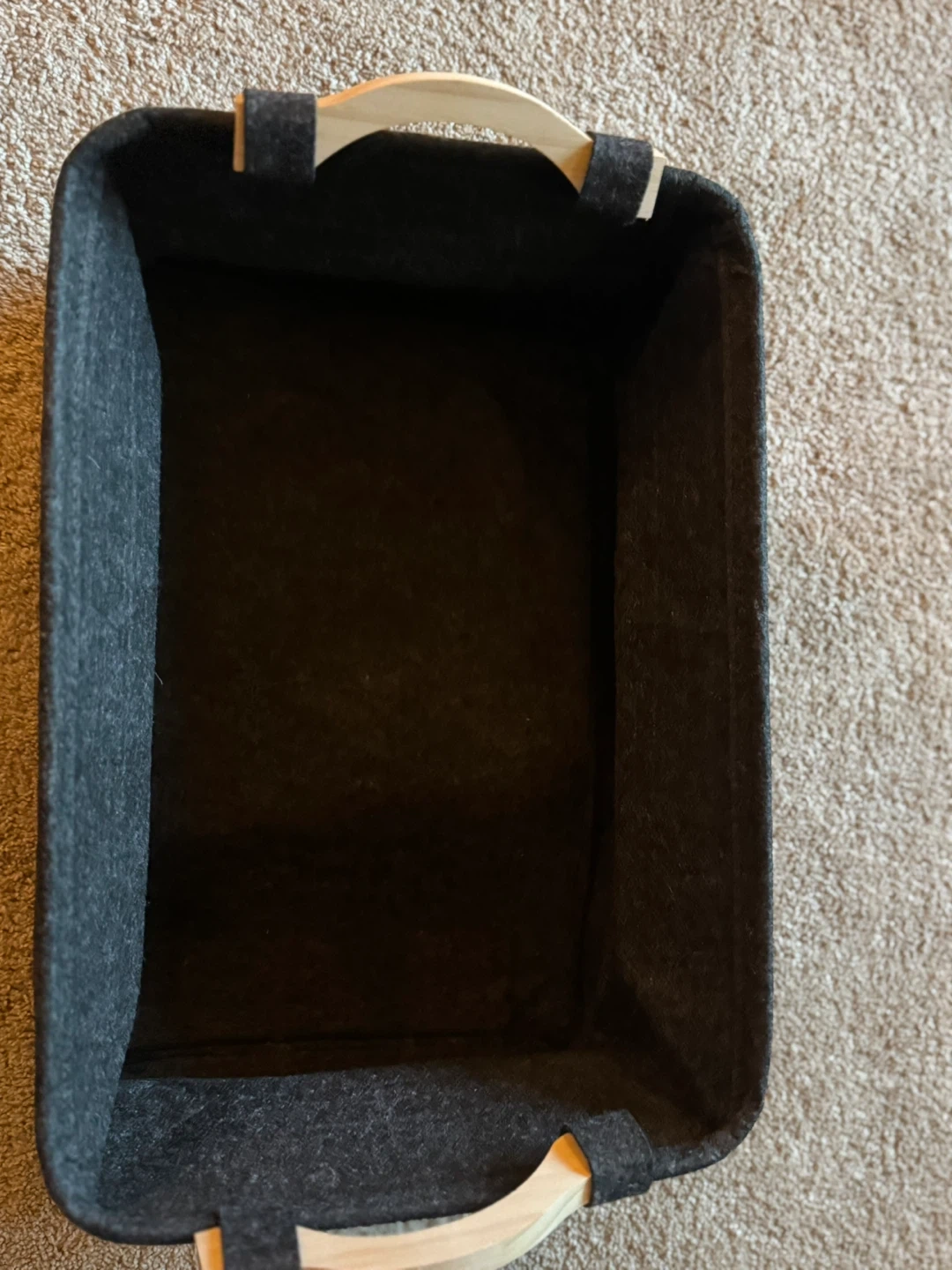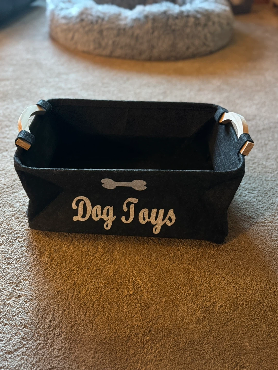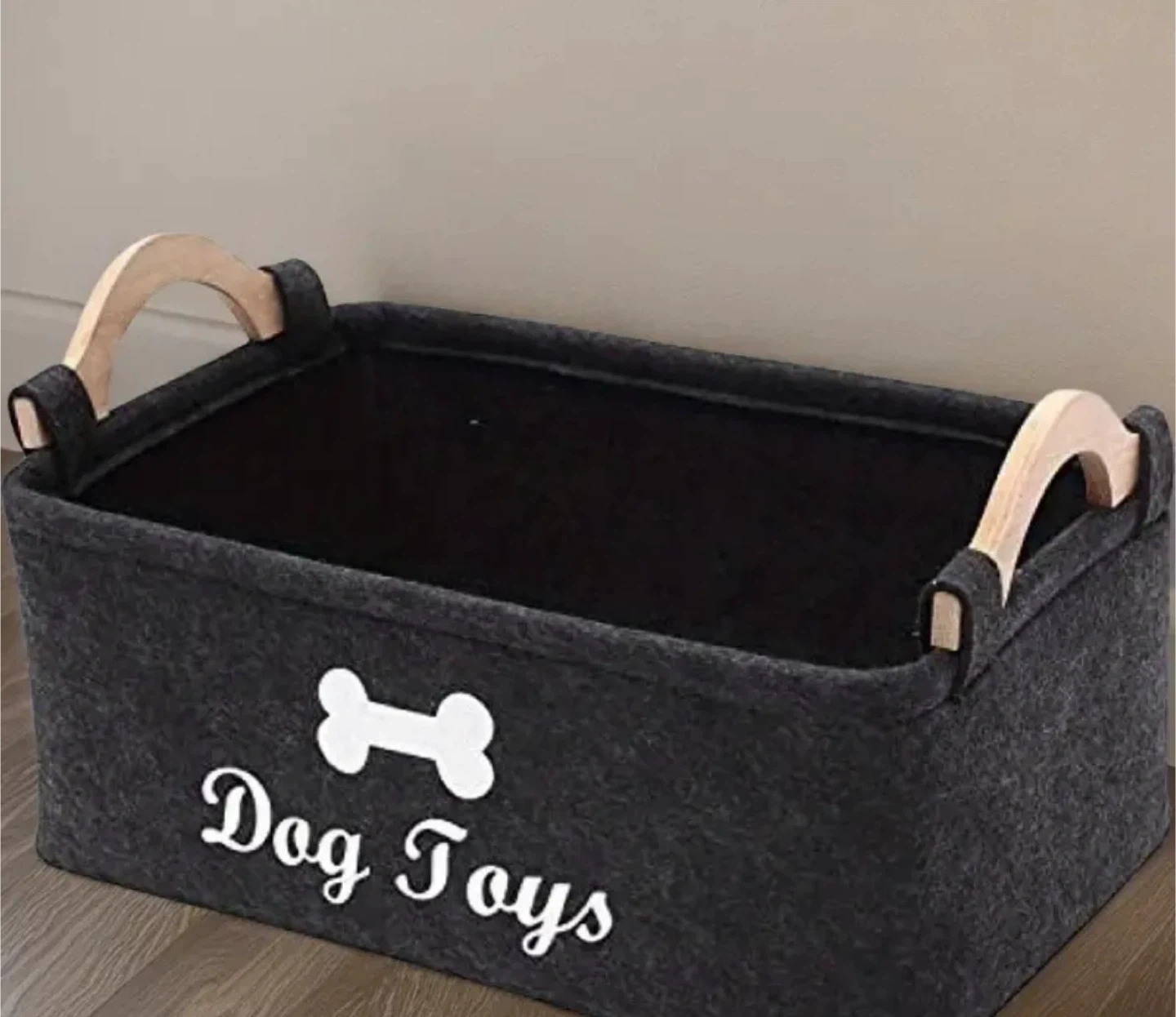 65This is a cute dog toy storage basket. It's black felt with wooden handles and has the words 'Dog Toys' written on the side. It's in great condition and ready for a new home. It measures about 15 inches long, 10 inches wide, and 7.5 inches tall