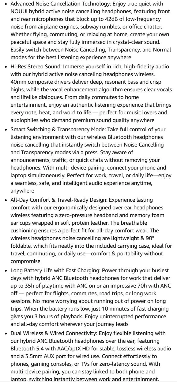 Advanced Noise Cancellation Technology: Enjoy true quiet with hybrid active noise cancelling headphones, featuring front and rear microphones that block up to 42dB of low-frequency noise from airplane engines, subway rumbles, or office chatter. Whether flying, commuting, or relaxing at home, create your own peaceful space and stay fully immersed in crystal-clear sound. Easily switch between Noise Cancelling, Transparency, and Normal modes for the best listening experience anywhere