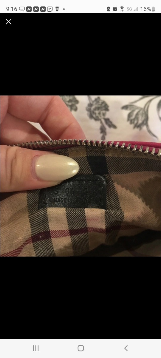 Authentic Burberry leather clutch with a top zipper closure. It has a chain strap with a leather shoulder strap. The inside has a Burberry signature lining.