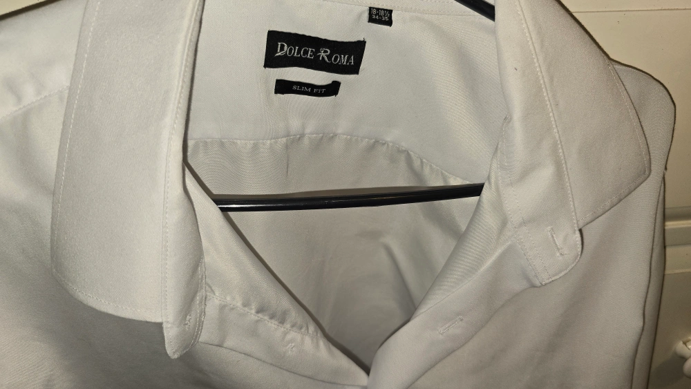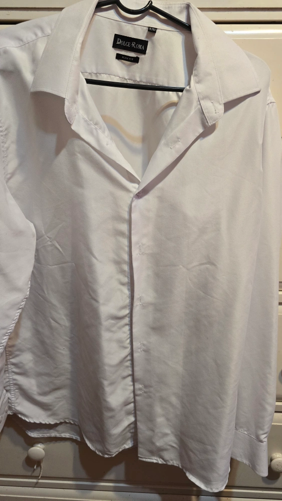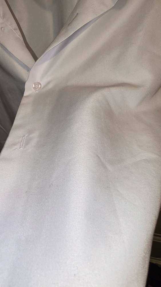 White silk dress shirt. Slim fit. Long sleeves. Button-down closure. A great shirt to wear for a work meeting or a night out.