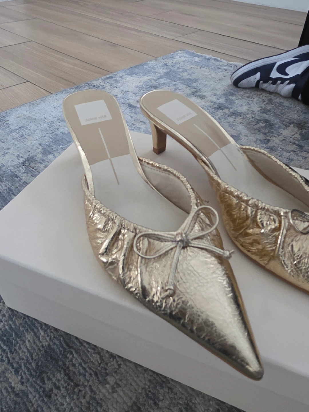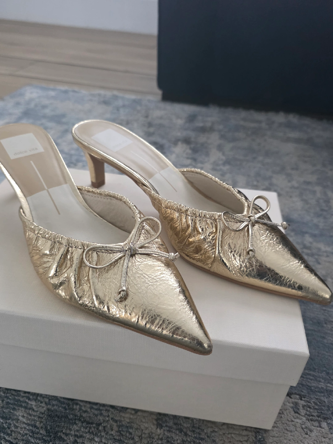 These are a pair of Dolce Vita gold mules, size 7. They have a small heel and a bow on the front. They are in good condition and come with the box