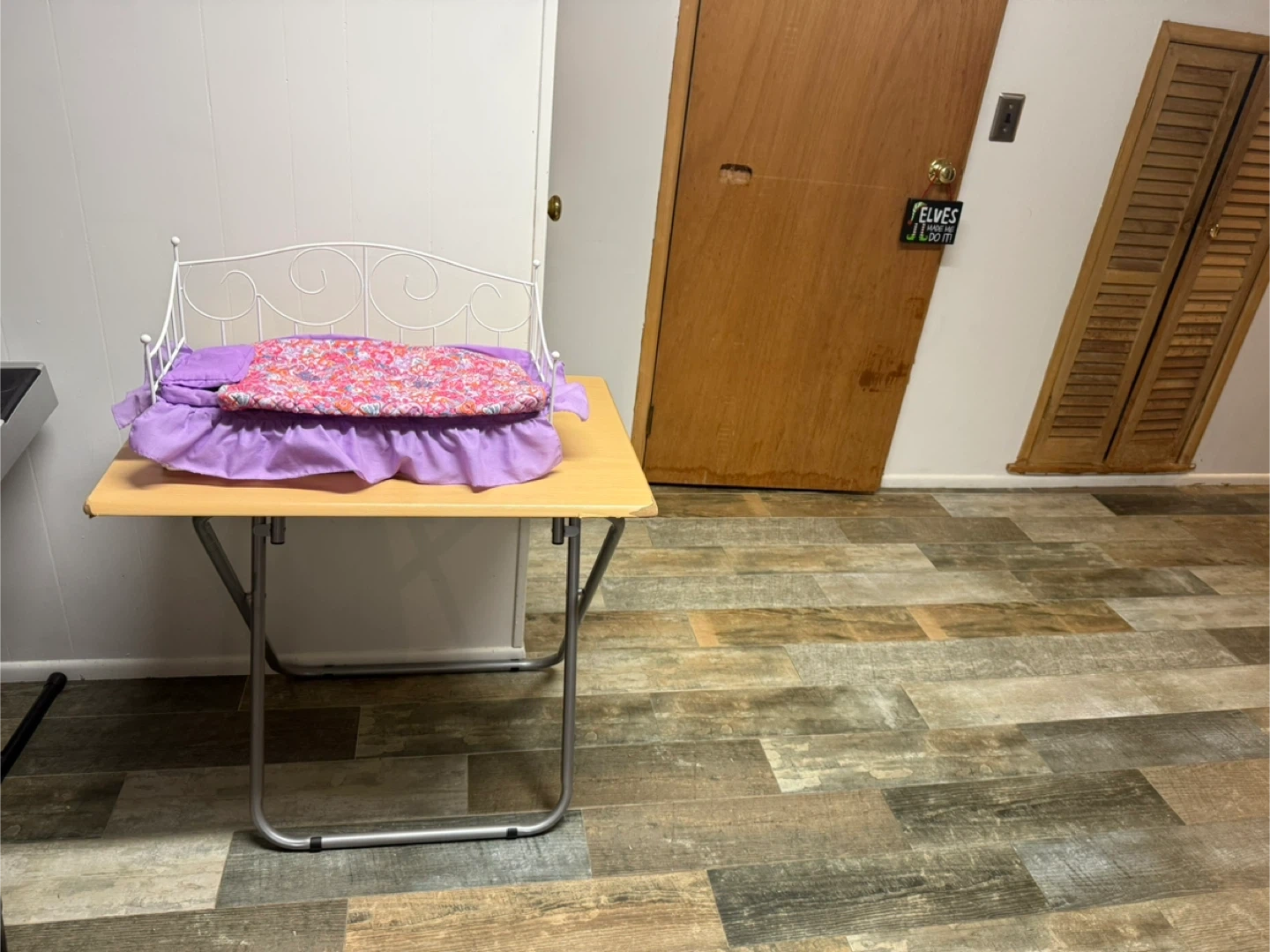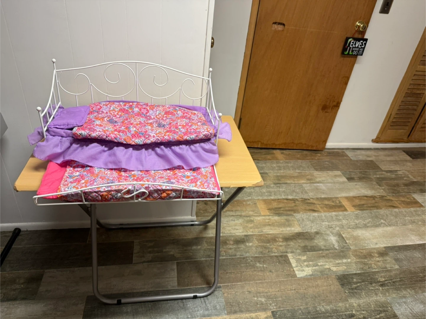 Here is a cute doll bed with bedding. It's perfect for your little one's favorite doll! The bed frame is white and the bedding is a mix of pink, purple, and floral patterns. It's in great condition and ready for a new home