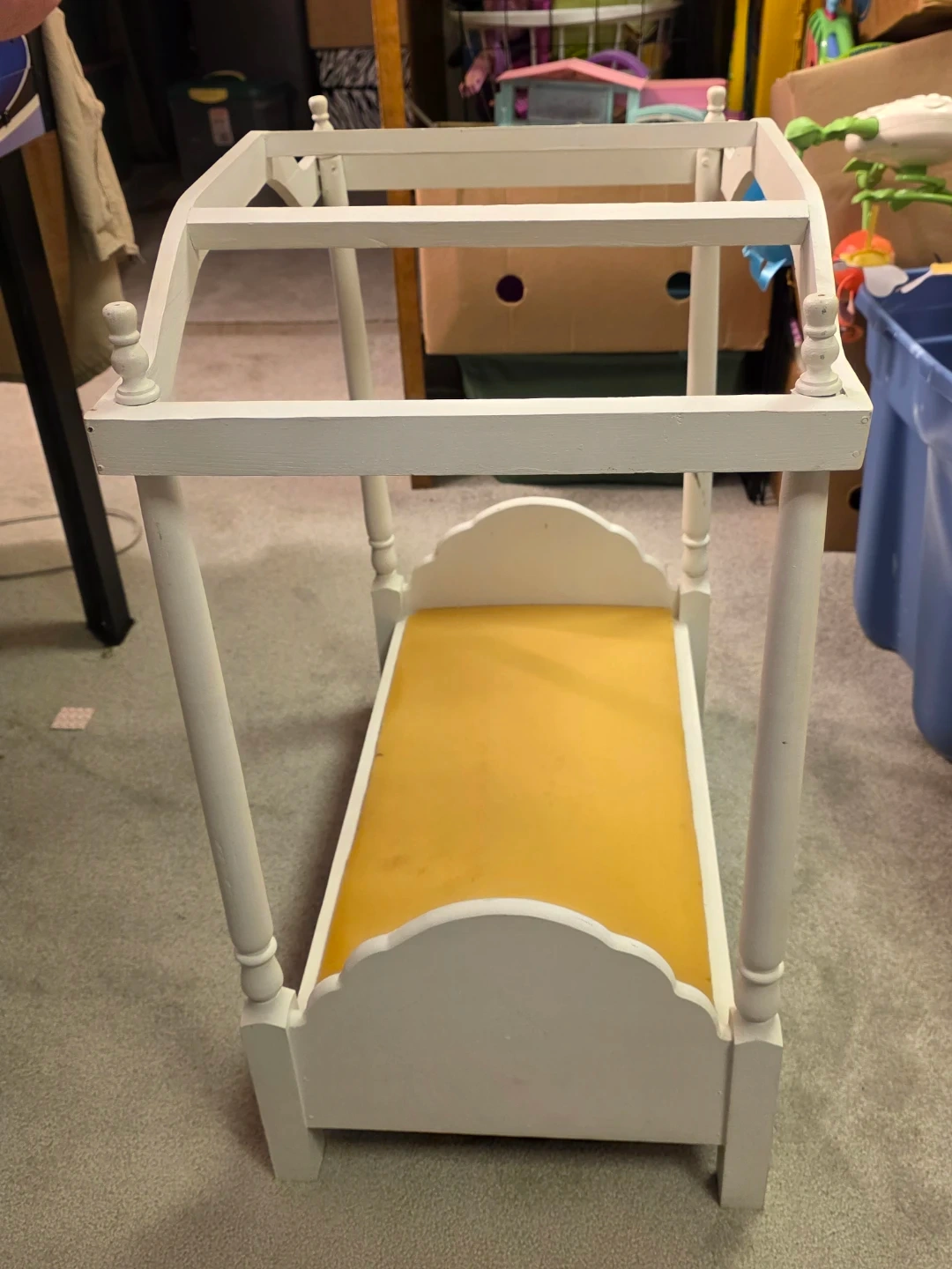 20Here's a cute doll bed with a canopy! It's perfect for your little one's favorite doll. The bed has a white frame and a mattress. The frame could use a fresh coat of paint. Pick up in Naperville near naper blvd and 87th street or near downtown Naperville off of Chicago and Charles