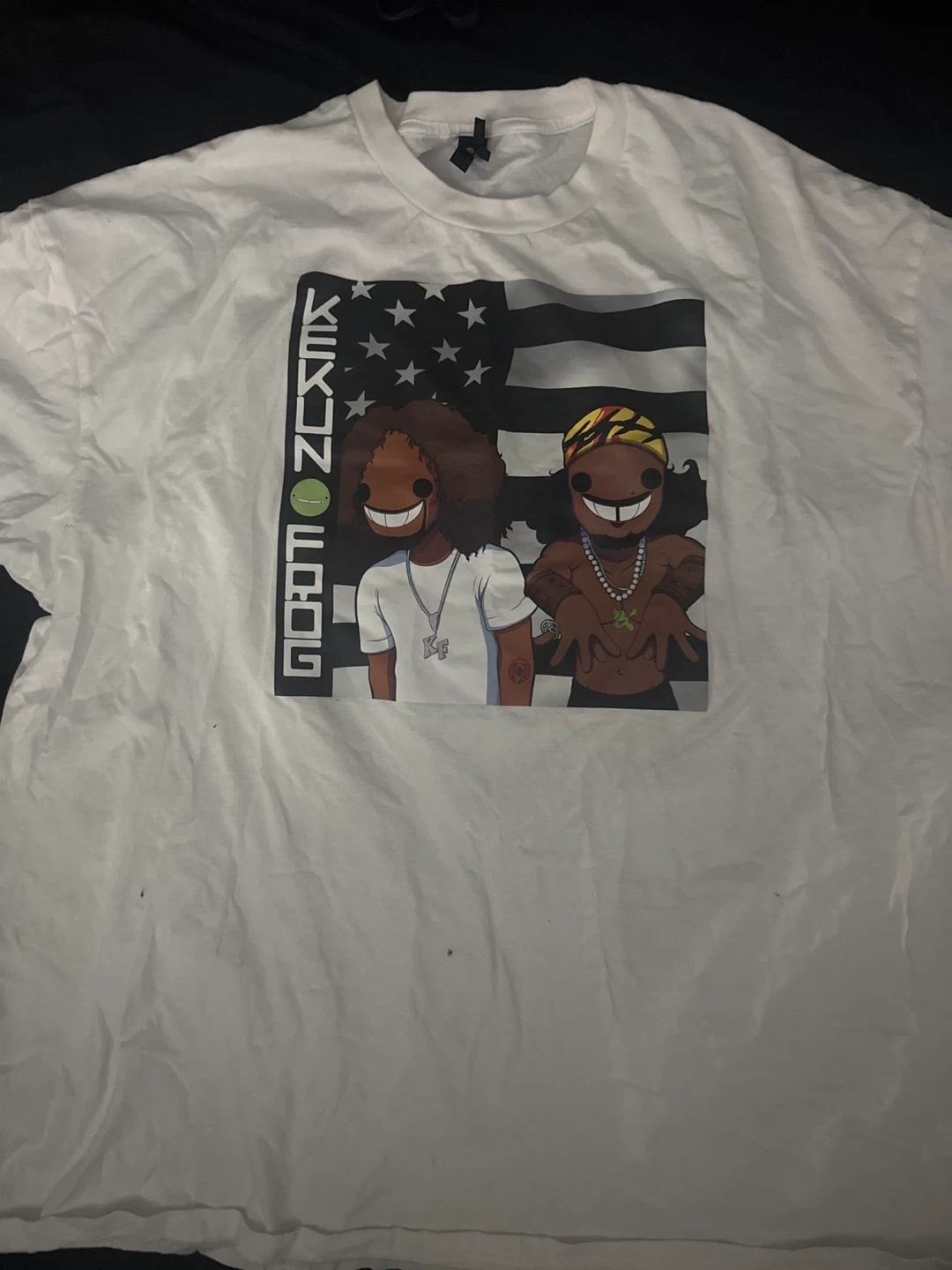 Selling a white t-shirt with a graphic design. There are a few small stains on the front.