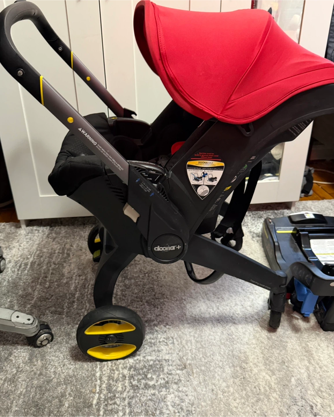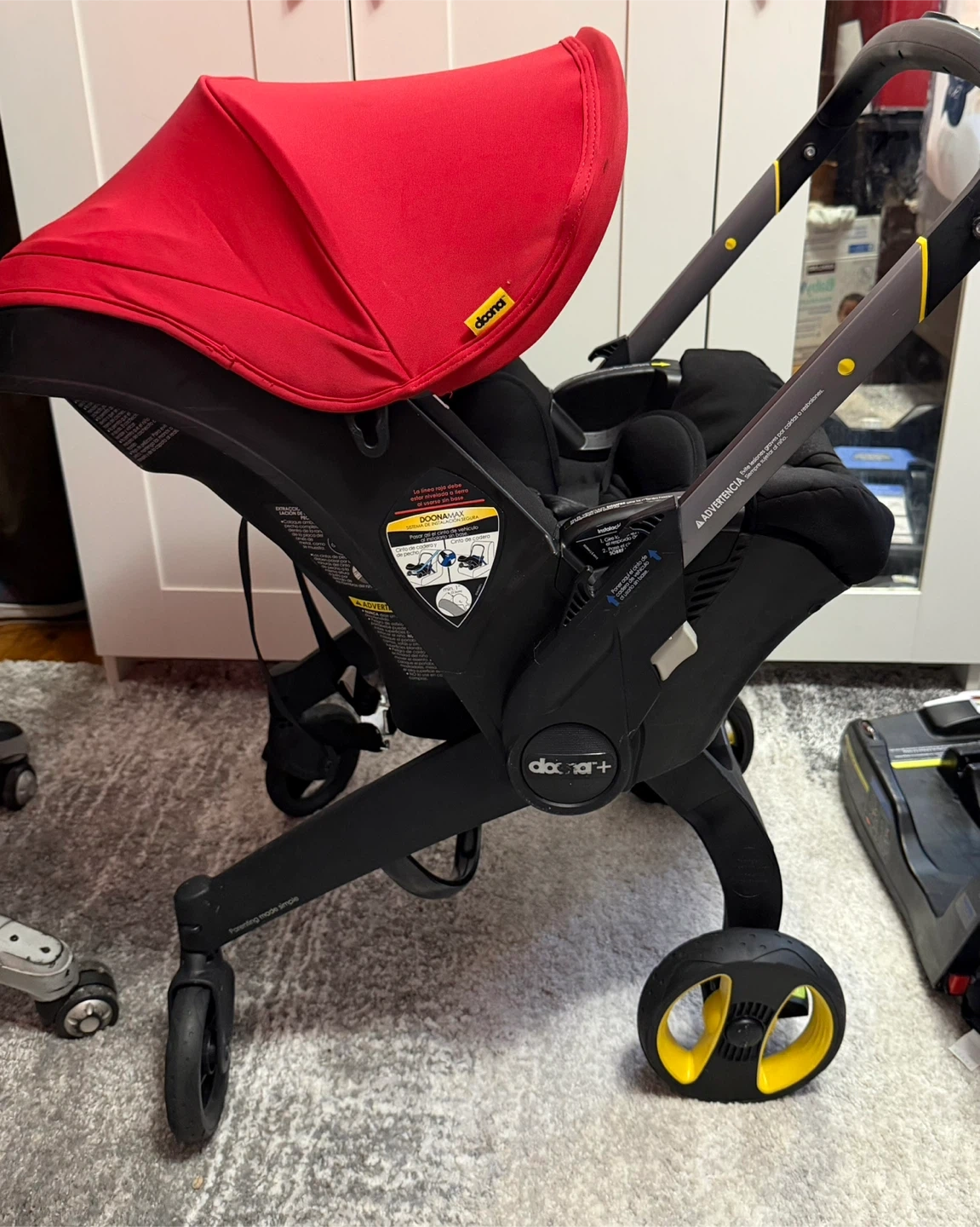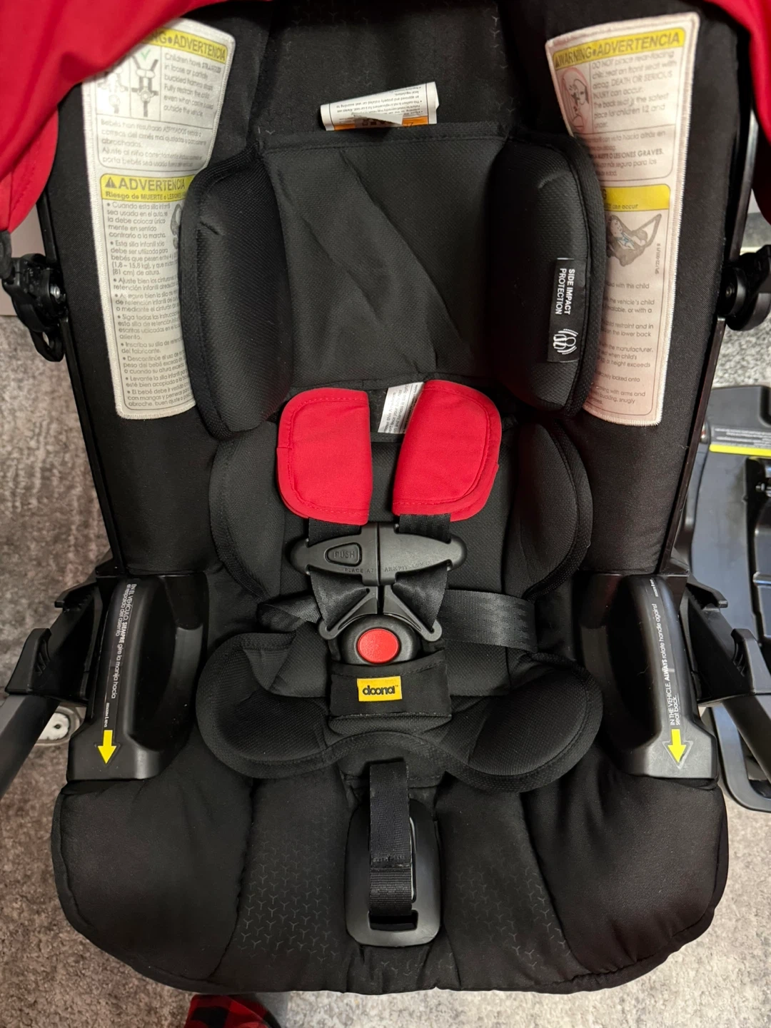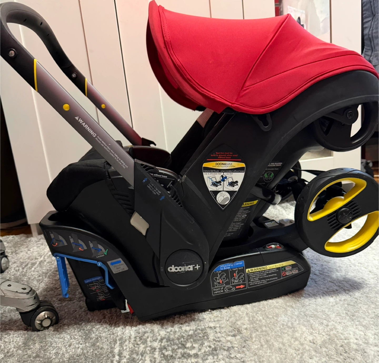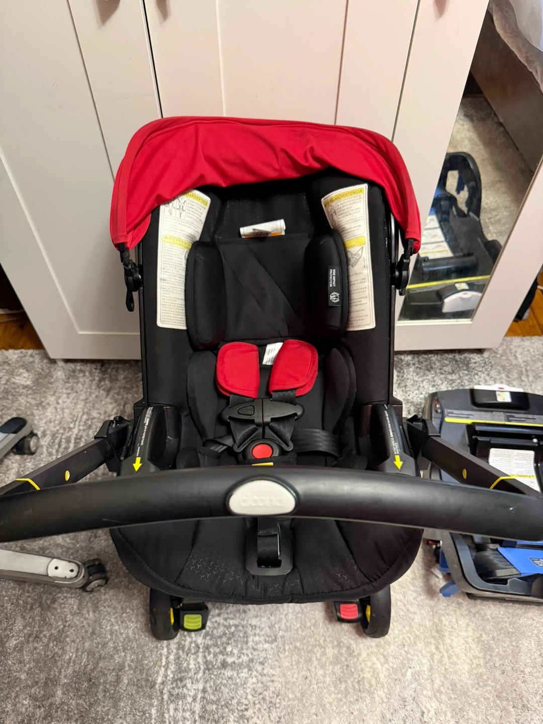 Selling a Doona+ infant car seat stroller in great condition! It's black with a red canopy. This is a convenient and safe option for transporting your little one. Perfect for parents on the go!