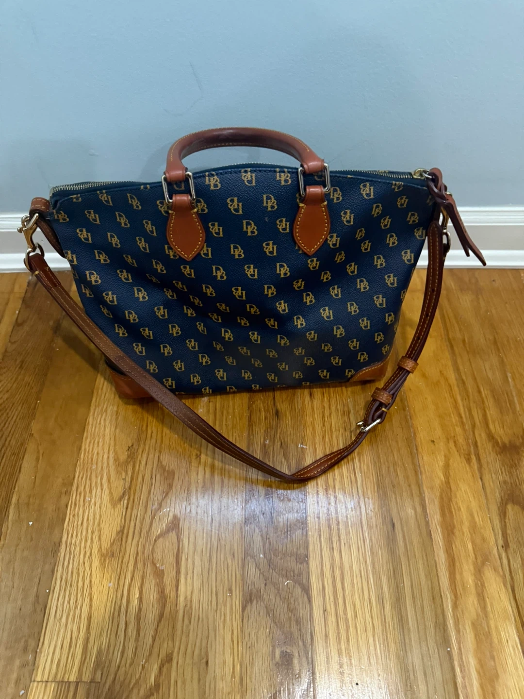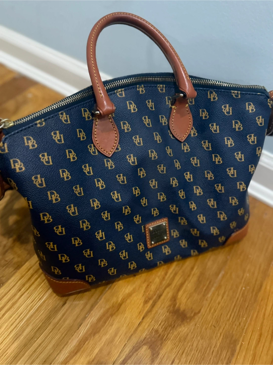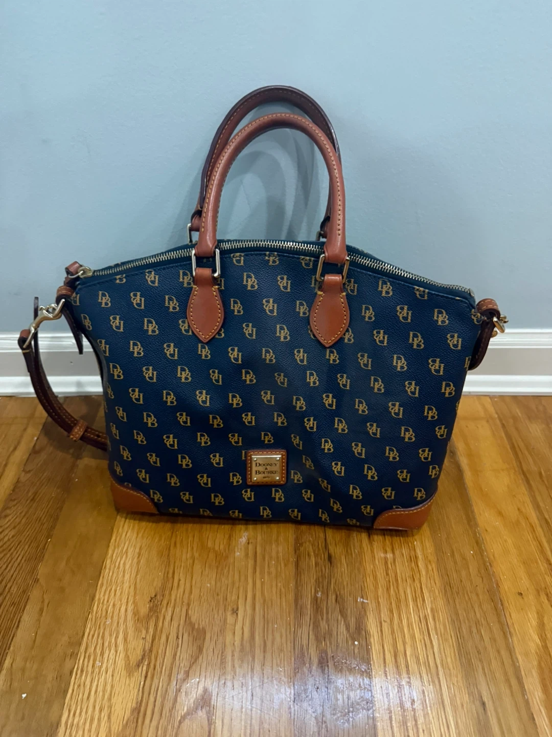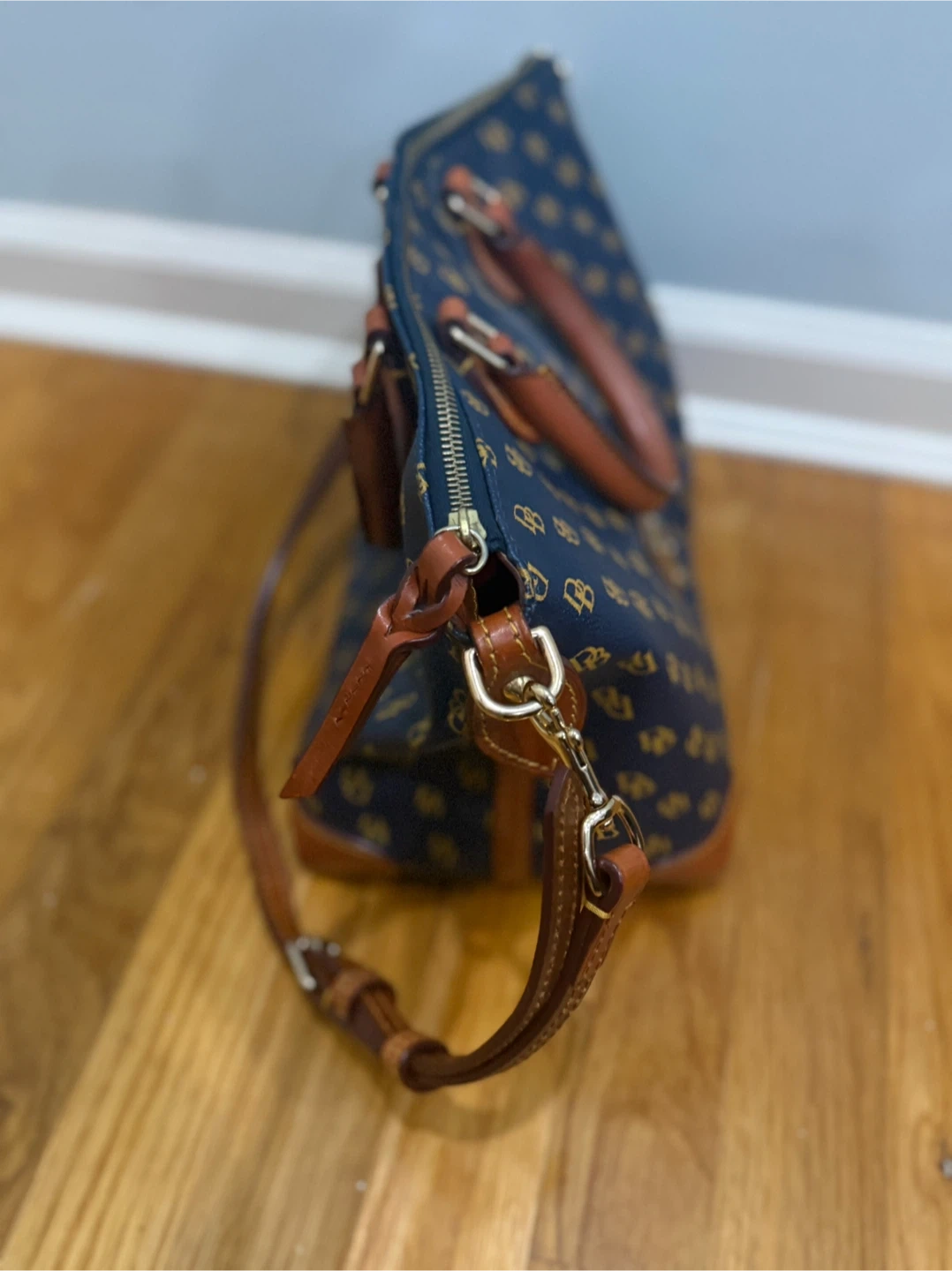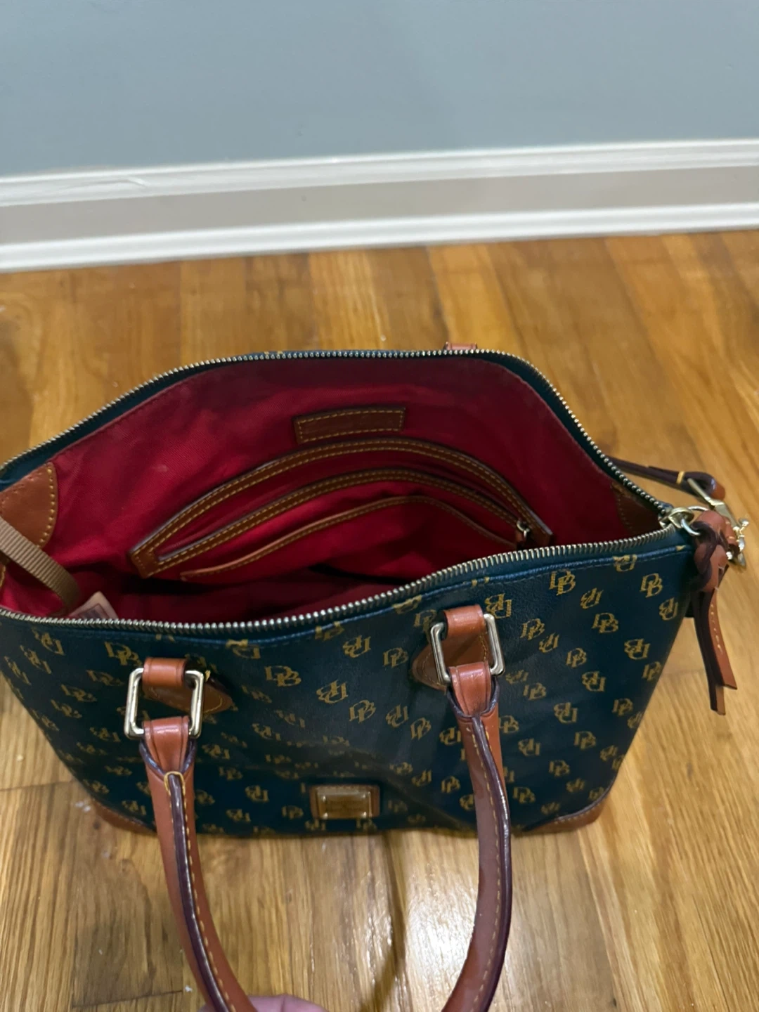 65This is a stylish Dooney & Bourke dome satchel. It features a distinctive "DB" pattern and leather trim. The interior is red and it has a zip closure. It's a great size for everyday use!