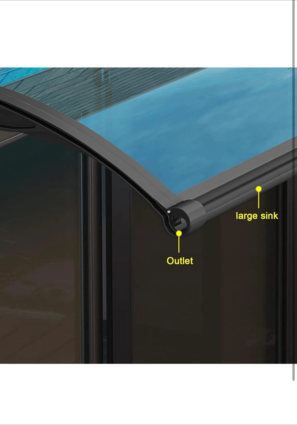 I'm selling a door awning/canopy with a polycarbonate solid sheet that is 2.5mm/0.1in thick. It's designed for high security, offering 200 times the strength of ordinary glass. The aluminum alloy bracket is rust-resistant, and it has a maximum carrying capacity of 300 kg/661 lbs.